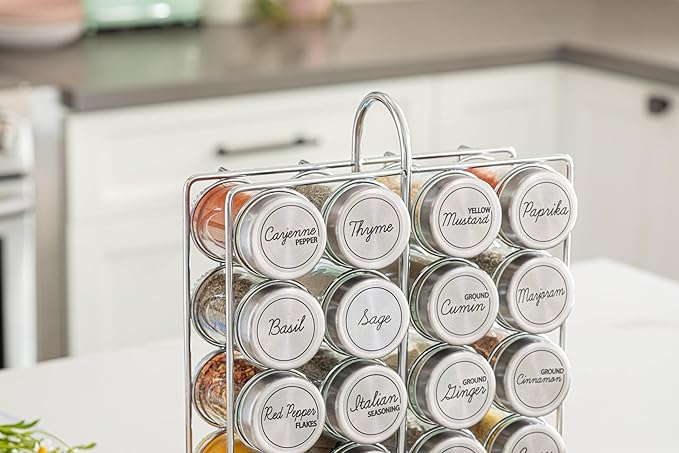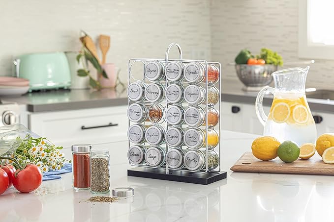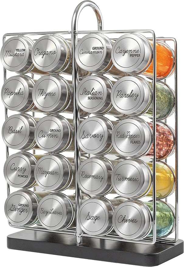 - Features: 20 jars spice rack set. Stainless Steel accent caps.