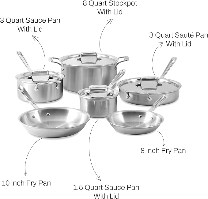 All-Clad D5 Brushed 5 Ply Stainless Steel Cookware Set 10 Piece w/ Frying Pans, Pots and Pans Set, Induction, Oven Broiler Safe 600F, Silver