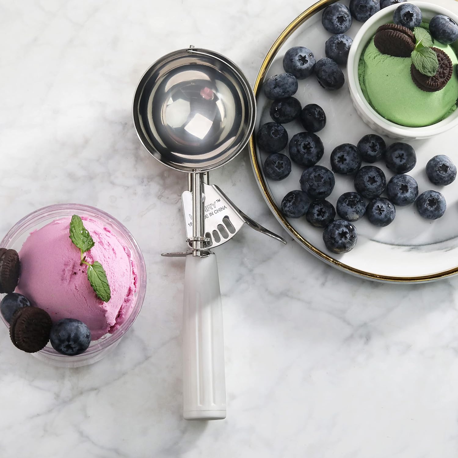 New Star Foodservice 34745 Commercial-Grade Thumb Press Food Disher/Ice Cream Scoop, 18/8 Stainless Steel, 4.67 oz, Size 6, White