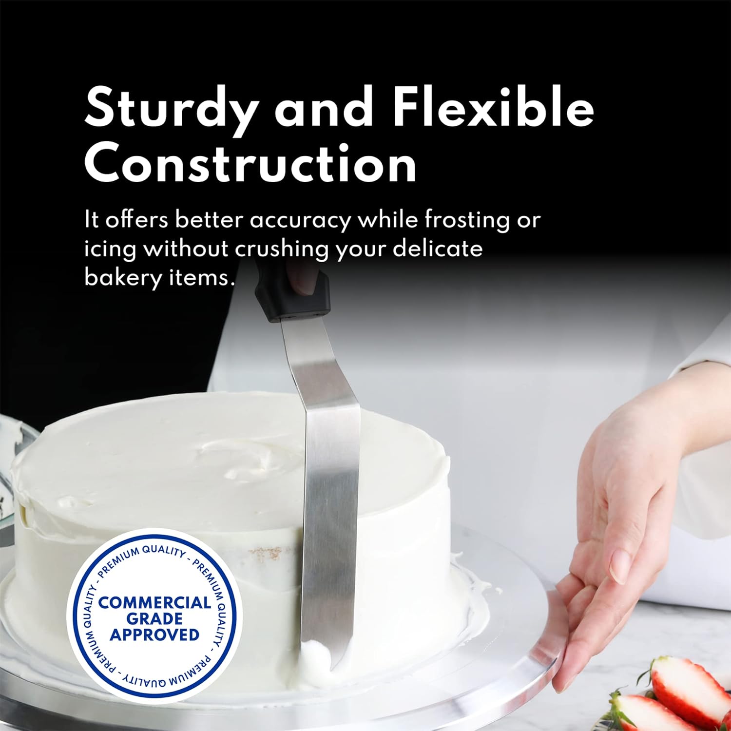 - Flexible stainless steel blade is the perfect thickness for gliding over icing and its angled design allows you to round corners easily