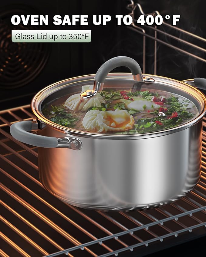 - Multi-Stove Compatible: The Stainless steel cookware is induction compatible and works on gas, electric, glass, ceramic, halogen, and more; Oven safe up to 400℉, lids up to 350℉; Dishwasher safe for easy cleaning