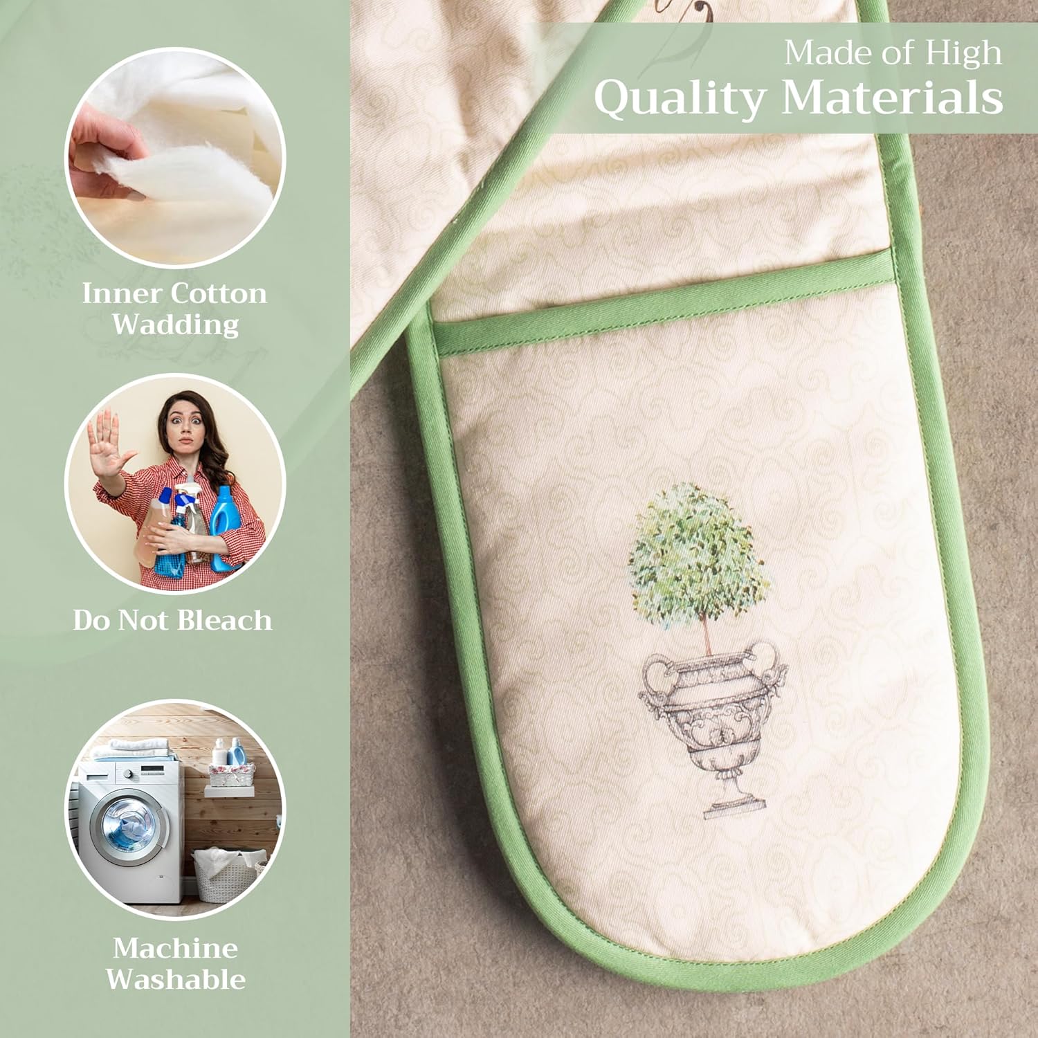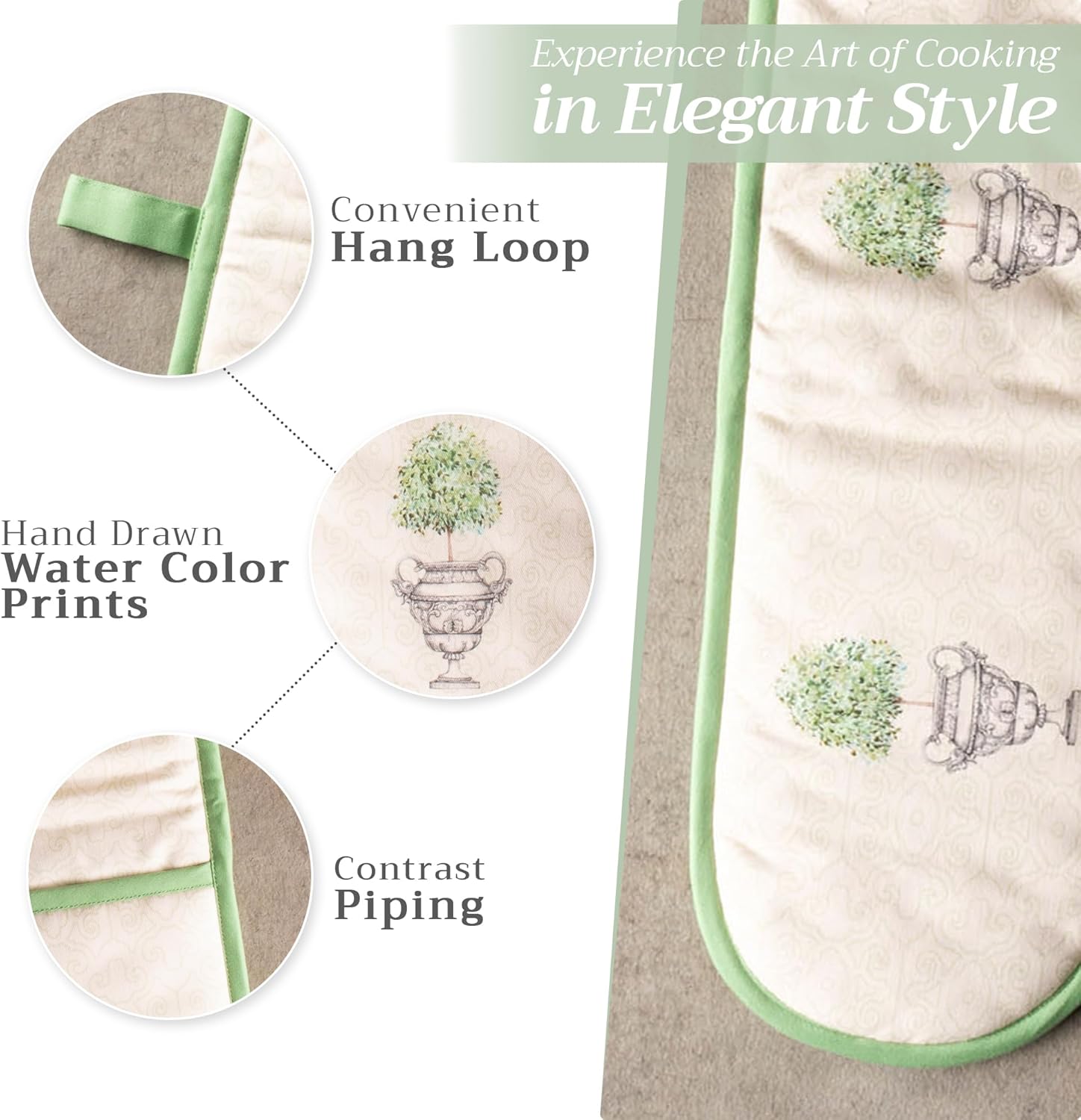 - Package includes: Includes 1 double oven mitt sized 7"x35". Perfect for handling hot cookware safely while adding a touch of European elegance to your kitchen. Designed in Europe and made in India with care
