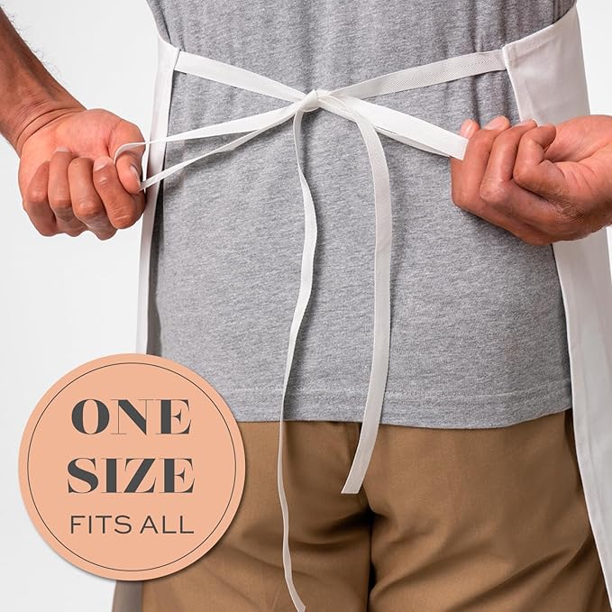 - White Apron Quality: our white aprons for cooking made with natural polyester fiber for eco-friendly and sustainable use. Poly material of white chef apron provides durability and protects your clothing from spills and stains. Thick and soft chef aprons fabric ensures comfort while cooking, baking, or grilling