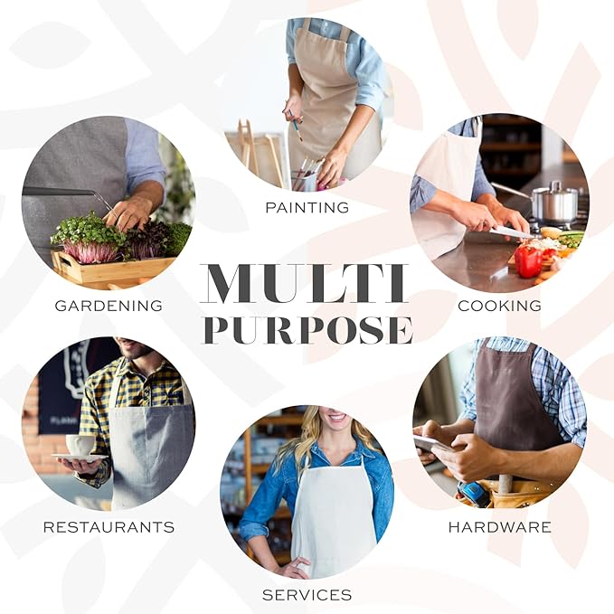 - Set of 2 kitchen aprons: Each kitchen apron is 32 x 28 inch with NO Pockets. Experience customizable comfort with our bib apron featuring a versatile 38-inch adjustable waist tie that can be wrapped from the front or back, crafted with the same durable material as the chef apron for men apron itself