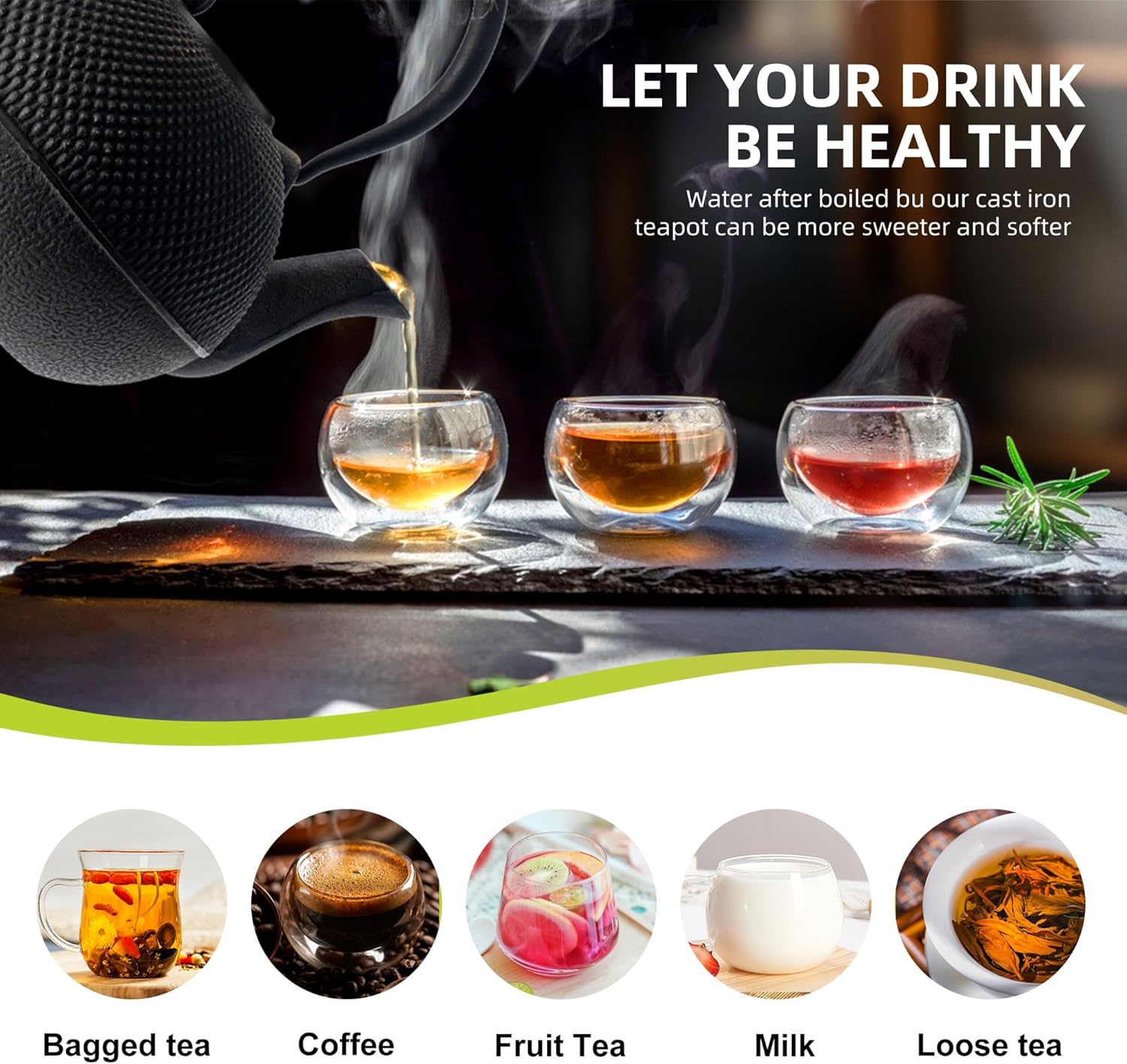 - 【GOOD FOR HEALTH】 Cast iron teapot let your drink water be healthy.Cast iron teapot can improve the water quality by releasing iron ions and absorbing chloride ions in water. So the water after boiled by our cast iron teapot can be more sweeter and softer, which is suitable for all kinds of tea making or other drinks making.