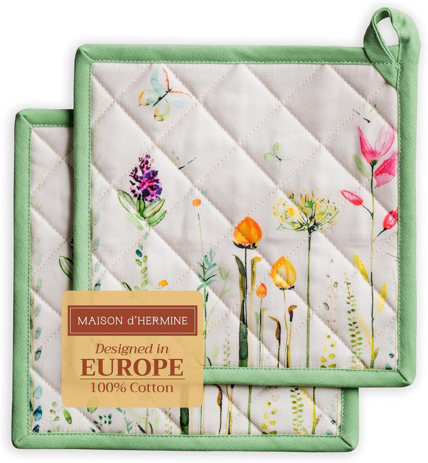 Maison d' Hermine Pot Holders set 100% Cotton Heat Resistant Potholders 8" x 8" Hot Pads with Loop BBQ, Cooking, Baking, Grilling, Kitchen, Handling Hot Pans Spring/Summer (Pack of 2, Botanical Fresh)