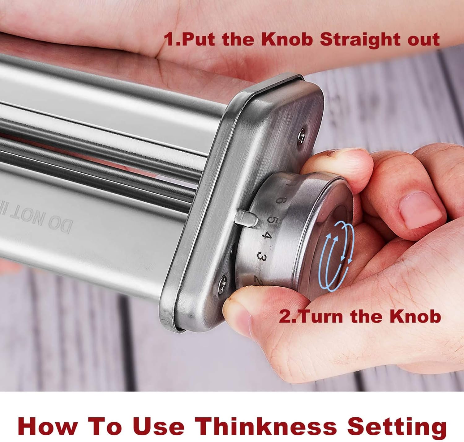 - [Multifunctional & Professional Pasta Attachment for Kitchenaid Stand Mixer] Regulating knob with 8 settings allows you to choose the dough sheet thickness, from 0.4 to 2 mm (0.016 to 0.08 in), change the texture and taste of your pasta with this simple adjustment; Pasta sheets can be cut with 1.6 or 6.3 mm (0.06 in or 0.25 in); Perfect for making angel hair pasta spaghetti, fettuccine, lasagna, dumpling skins and more, caters to all your pasta making needs