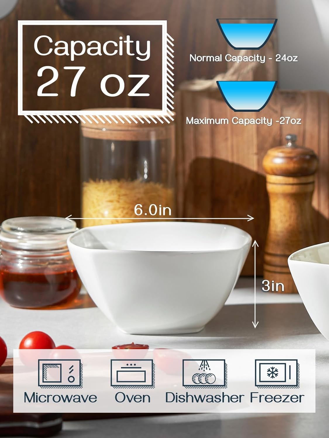 - Elegant & Modern Design – Featuring a sleek square shape with gently rounded corners, these white cereal bowls add a touch of sophistication to any kitchen or dining table. Perfect for everyday meals or upscale restaurants, they enhance the dining experience with their contemporary charm.