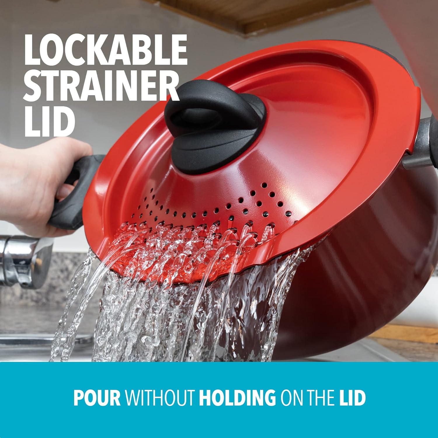 - LOCKABLE STRAINER LID: Twisting and locking securely in place, the pot strainer lid features integrated straining holes for a safer and more convenient way to drain excess water from your large pot without your food spilling out of the pot.