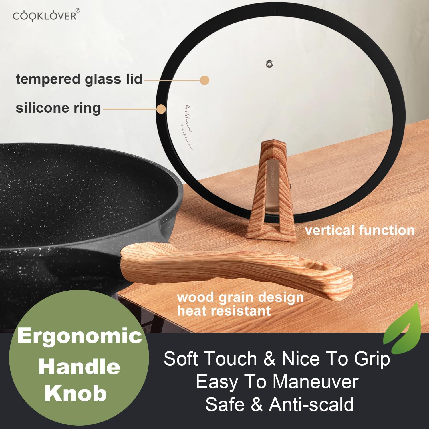 - ✅Ergonomic Bakelite knob and handle: COOKLOVER's wok builds with Eye-catching heat resistant soft touch silicone robust Bakelite knob and handle with beautiful wood grain design (not real wood). Stay cool and comfortable. Easy to maneuver, Safe & Anti-scald.
