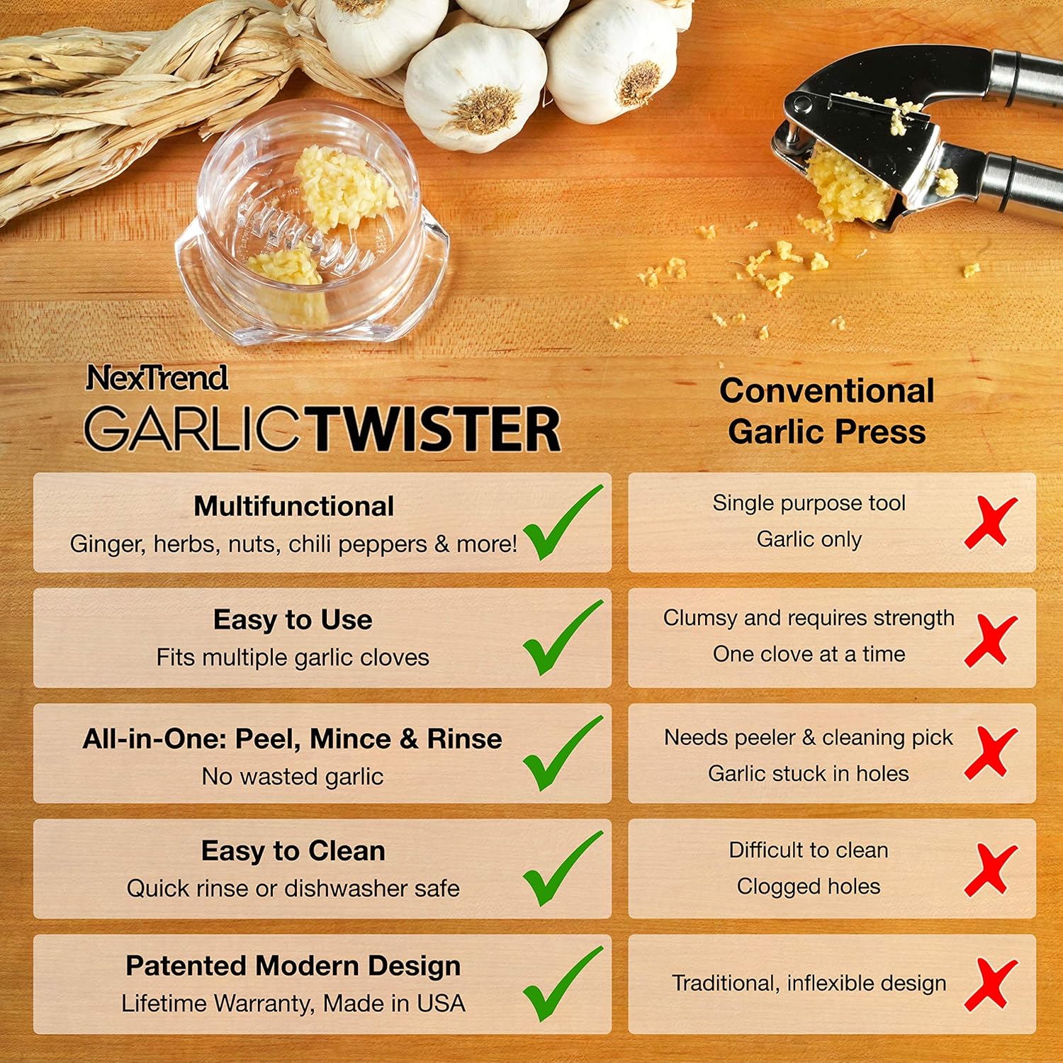- [ MULTIFUNCTIONAL ] Handheld Kitchen Tool that can mince all kinds of ingredients, from garlic, to ginger, herbs, nuts and more! [ INSTRUCTIONS ] Use the Garlic Twister to "Smash" the garlic clove and loosen the skin for peeling (see video) this also softens the garlic. Place 2-3 cloves in the unit, and progressively twist while working your way down. Expect minced bits mixed with juices to come out!