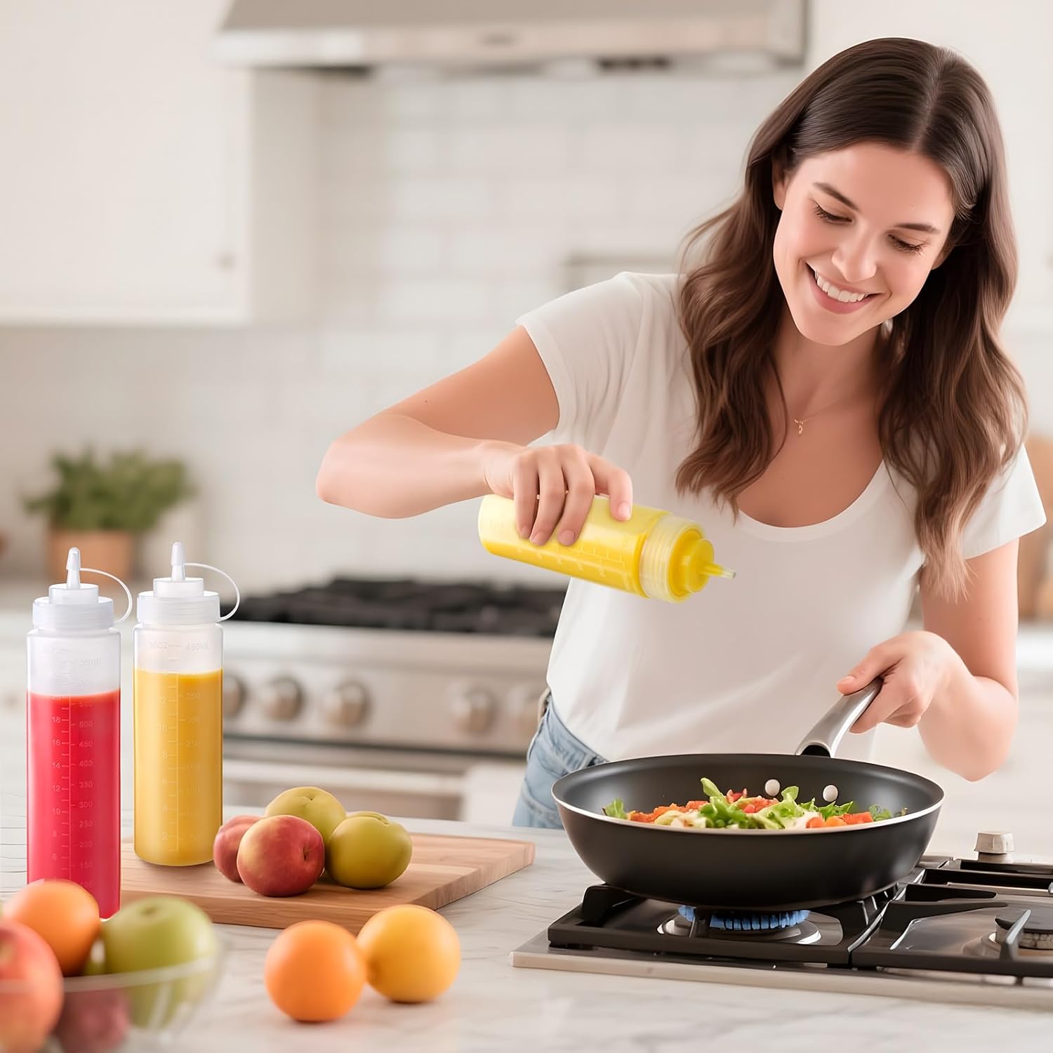 - Package Contains: 8 pack of 12 oz (360 ml) squeezable squirting bottles with new structure design lid(double-layer leak-proof lid), also come with 1 Silicone Funnel, 8 Chalk Labels, 1 Pen. When you full with bottle, it capacity is 400 ml(about 13.5 oz)
