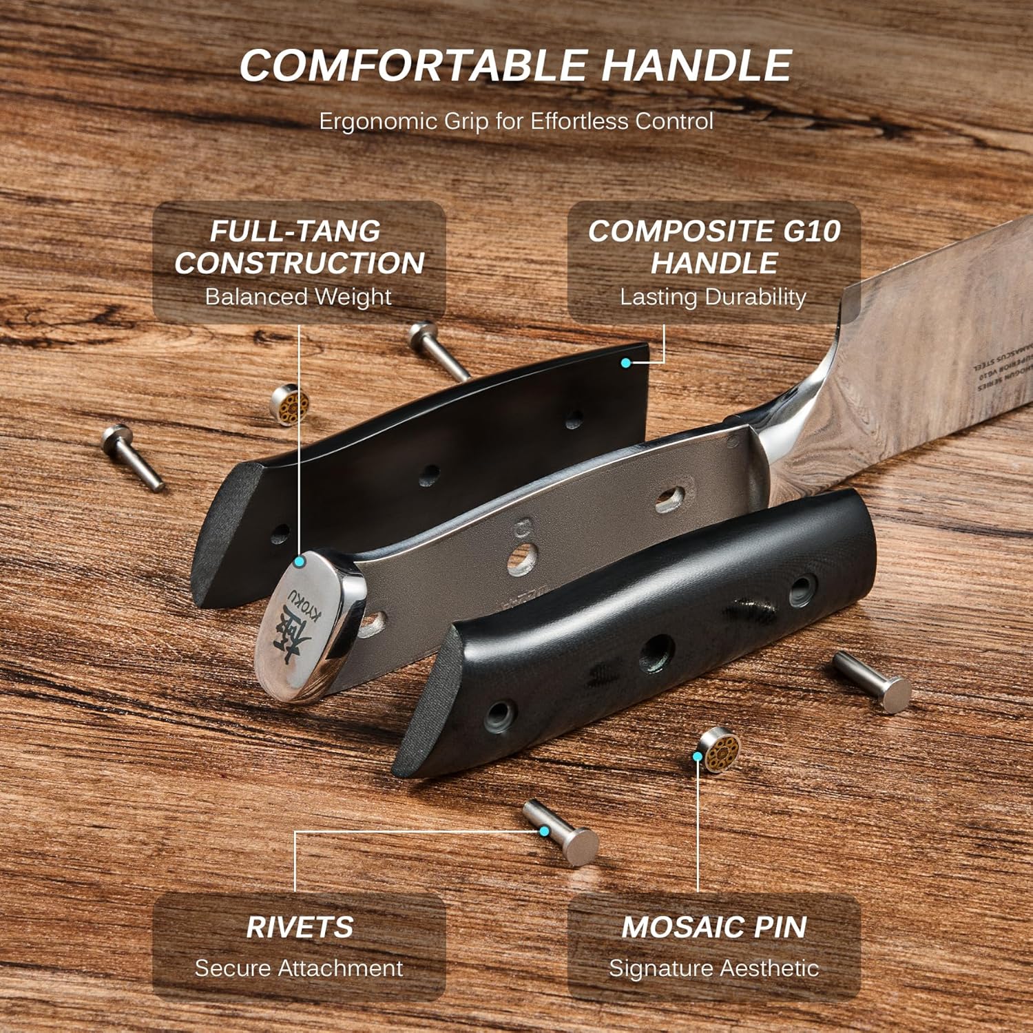 - 8" chef knife: This all-purpose knife is part of Kyoku, manufactured with modern technology and traditional craftsmanship; its Japanese 67 layer Damascus VG-10 steel blade has been cryogenically treated and paired with a perfectly balanced handle offering superior precision and control for home chefs and culinary professionals alike