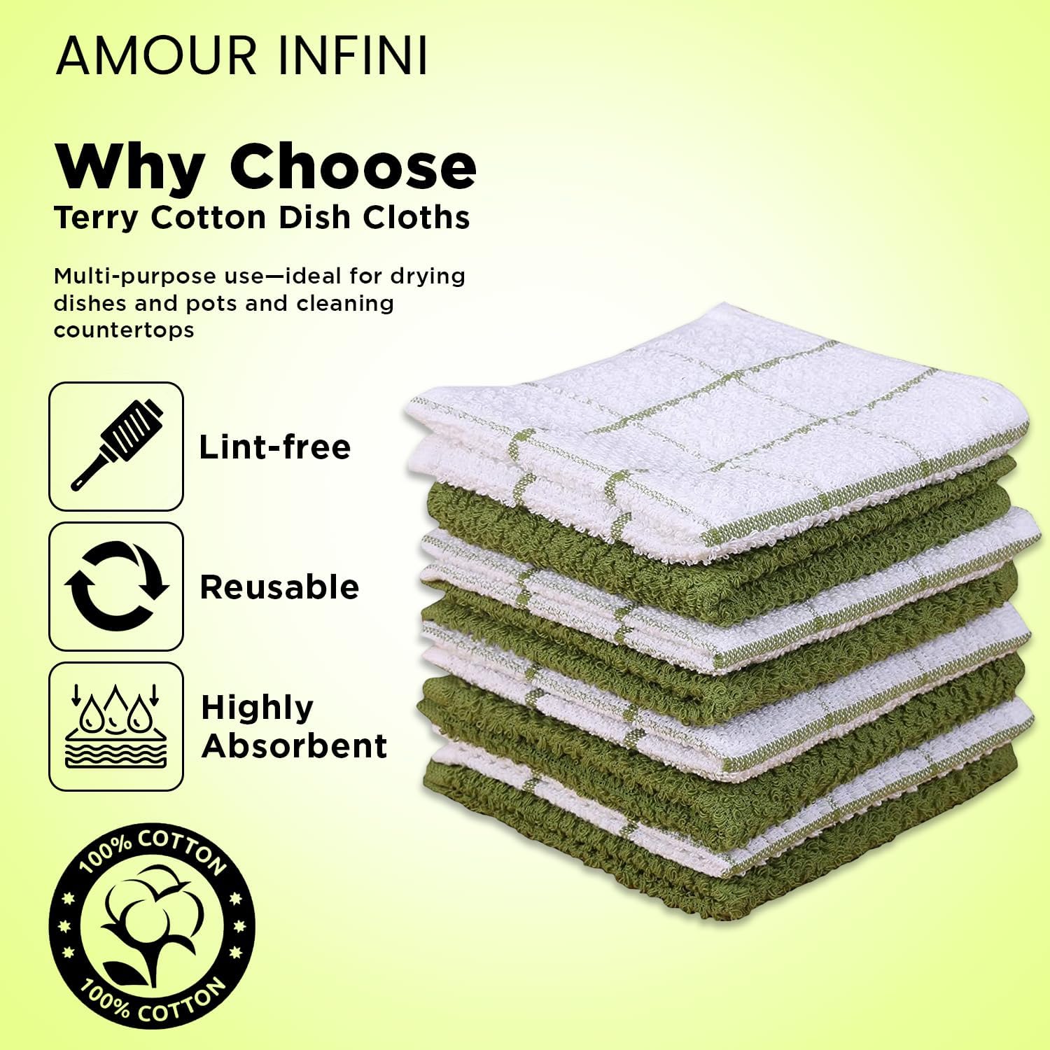 AMOUR INFINI Cotton Kitchen Dish Cloths Set of 8 – Highly Absorbent, Super Soft Premium Terry Cleaning Cloth (12"x12" Inch) Premium Dishcloths for Washing Dishes (Green)