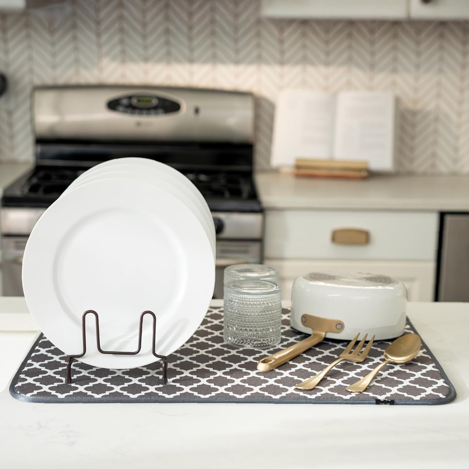 S&T INC. Dish Drying Mat XL, 18” x 24”, Absorbent Microfiber Kitchen Counter Mat, Dish Drying Pad for Dishes, Utensils, Pots and Pans, Extra Large, Pewter Grey Trellis