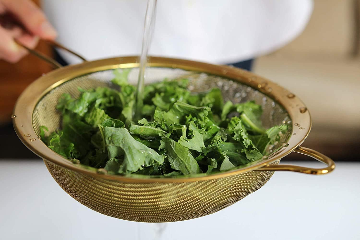 - TITANIUM ECO-FRIENDLY AND STYLISH GOLD COLOR FINISH - our kitchen strainers feature a titanium Physical Vapour Deposition eco-friendly coating. The PVD applied to all our food strainers is the highest quality coating and the entire process is environmentally harmless