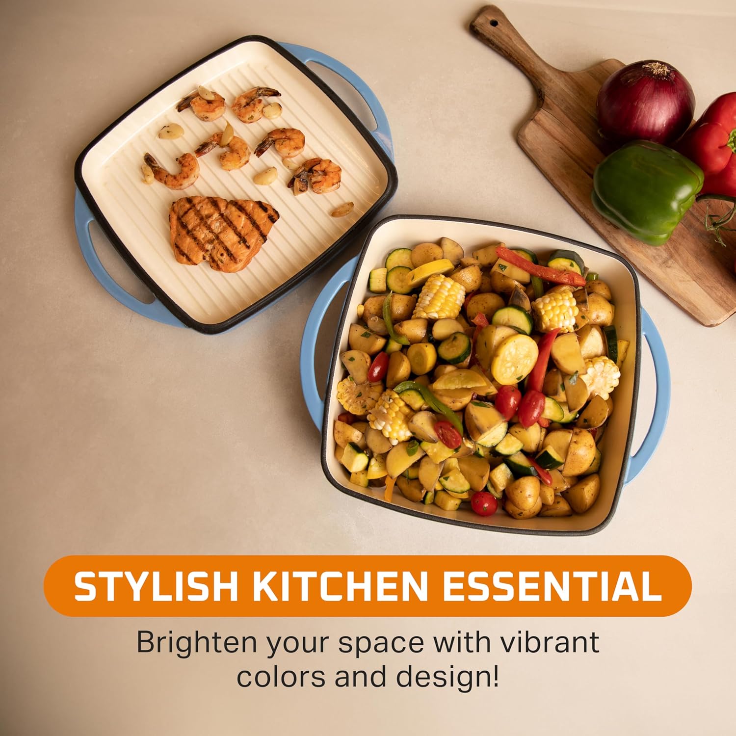 Bruntmor 2-in-1 Pre-Seasoned Square Cast Iron Dutch Oven with Dual Handles, Non Stick Pan with Grill, All-in-One Cookware Set, Cast Iron Casserole Dish with Lid for Braising Dishes,Whale Blue