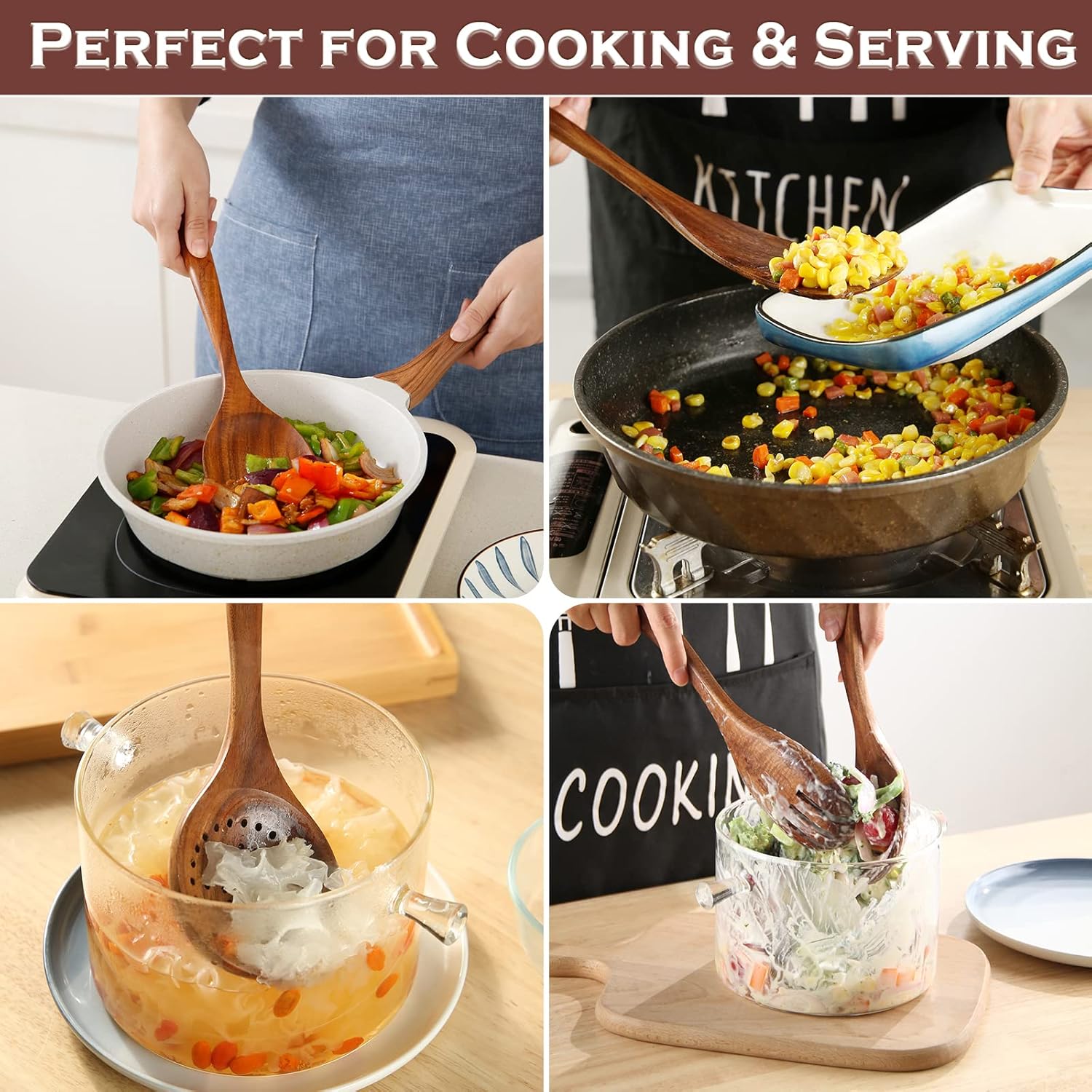 - 【Non-Toxic & Eco-Friendly】: The BPA free kitchen cooking utensils set is made of 100% great teak wood. No chemical substances, non-toxic, no peculiar smell for safe use. This wood material is hard, not easy to deform and crack. Long-term use that is still bright as new.