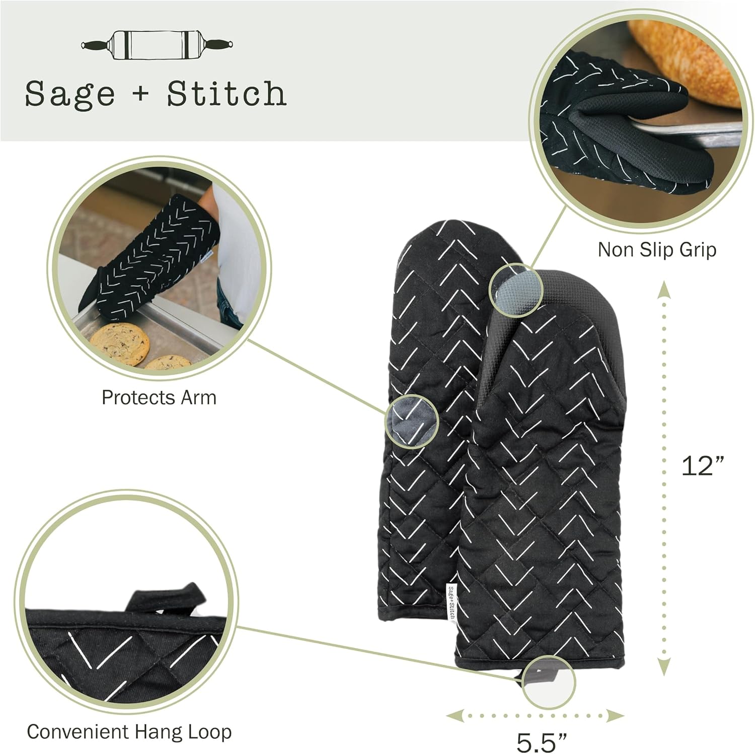 - Functional Design: Each 5.5" wide x 12" long Sage and Stitch designer oven mitt includes a non-slip neoprene grip which offers additional heat protection while allowing you to grab hot pots, pans, and cookie sheets with confidence. Additionally, they are each equipped with a hanging loop for easy storage and use.