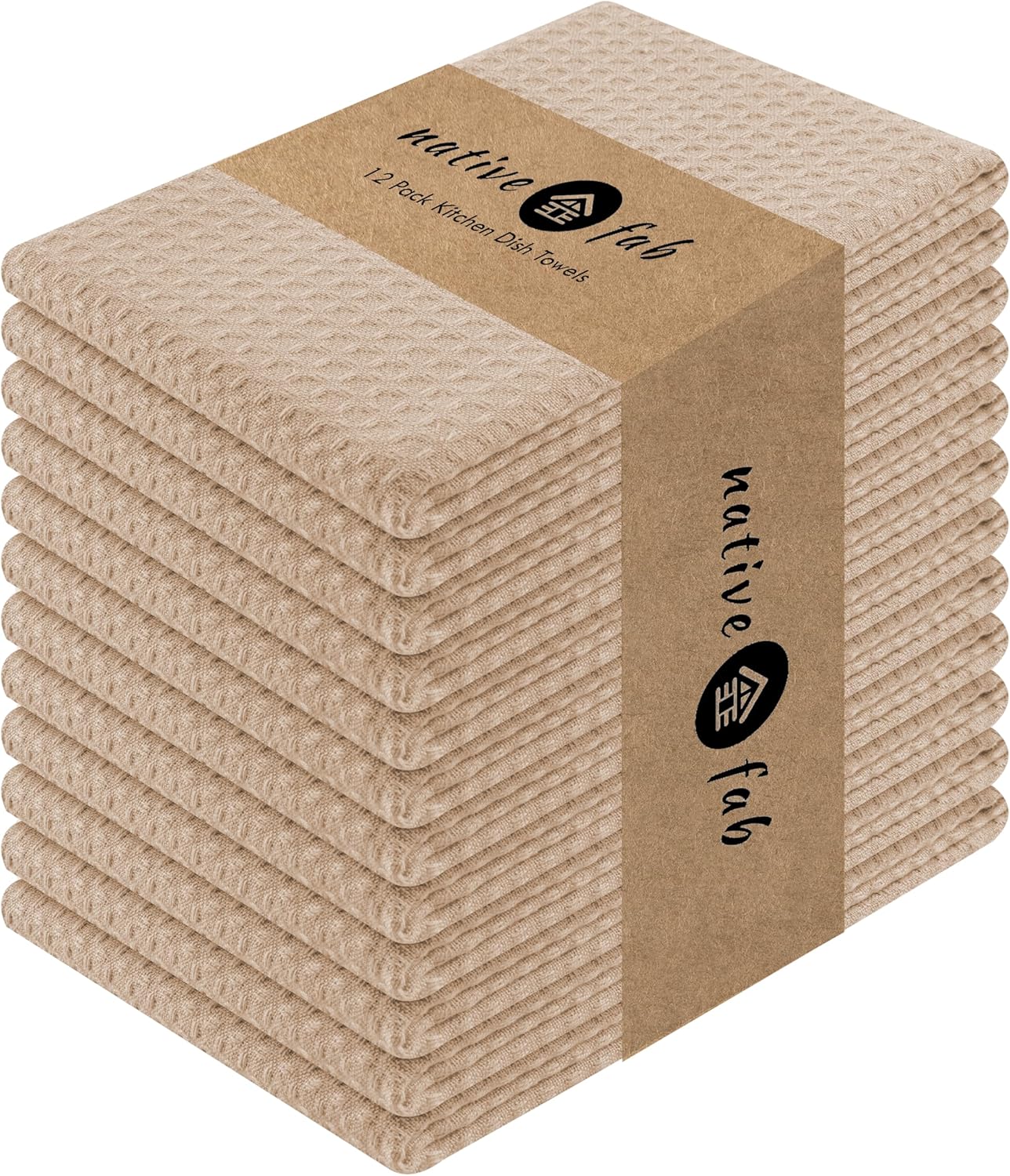 Native Fab Cotton Kitchen Towel with Hanging Loop 16x26 inches, 12-Pack, Waffle Weave Kitchen Towels for Cleaning Drying, Washcloths Soft & Absorbent Cloth Rags, Bar Towel, Dish Cloth, Beige
