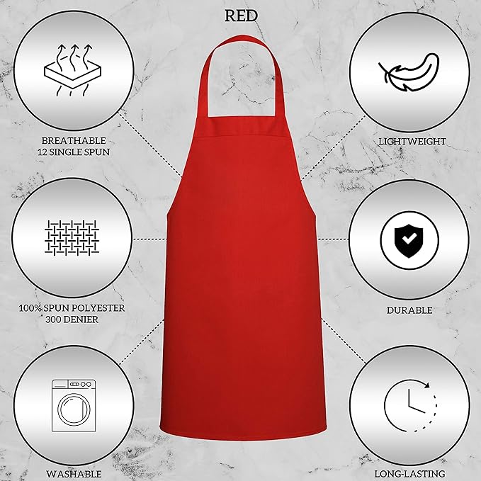 - Value Pack: 12 Red apron bulk set is the best value for bib aprons. Made of 100% spun polyester. Great value that is also available in a pack of 3, 12 and 120. These aprons are available in no pocket as well as 3 pocket. Made for heavy duty restaurants at a price convenient for home use