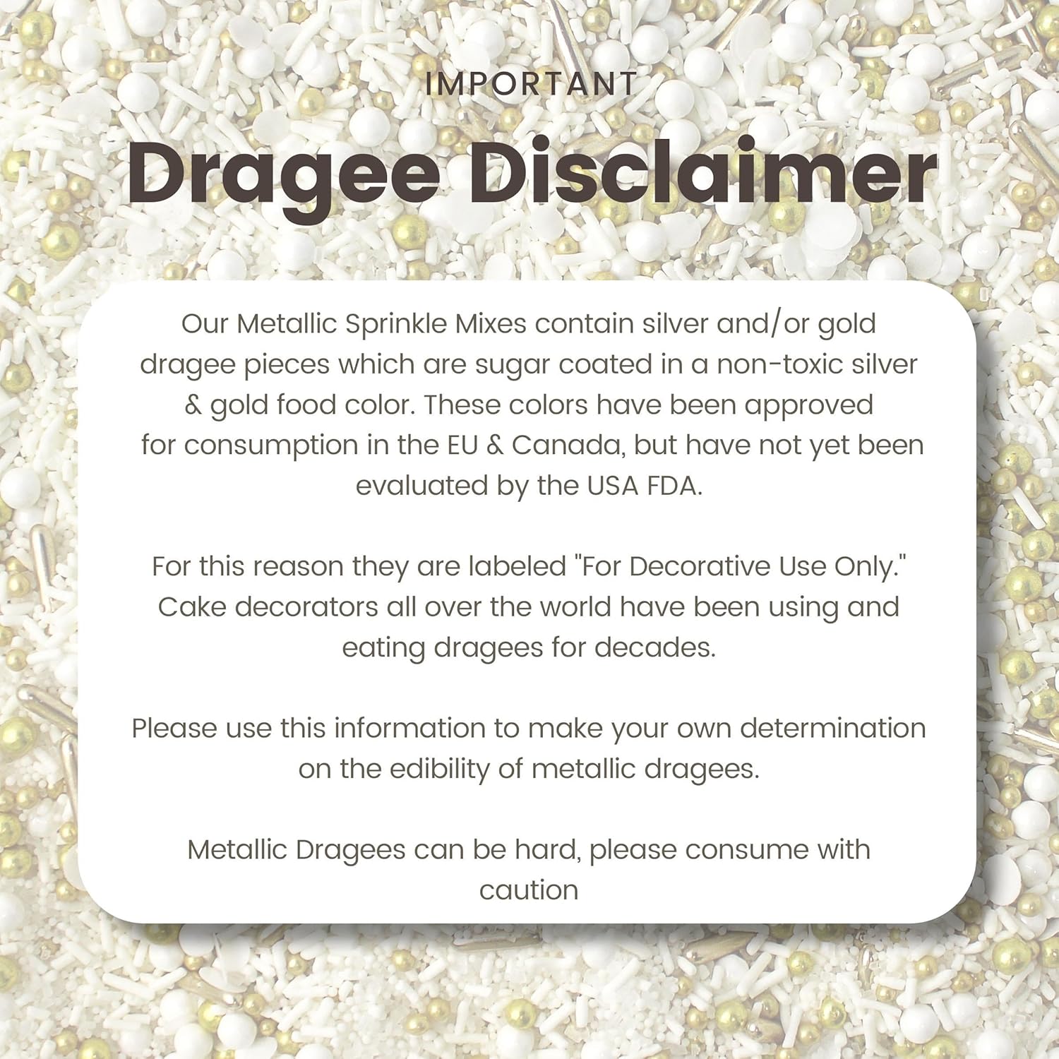 - Metallic Dragees Disclaimer: Silver and gold dragees are commonly used by cake decorators worldwide. While approved for consumption in some regions, they are traditionally labeled as “For Decorative Use Only” in the U.S. Please use discretion when adding them to your creations