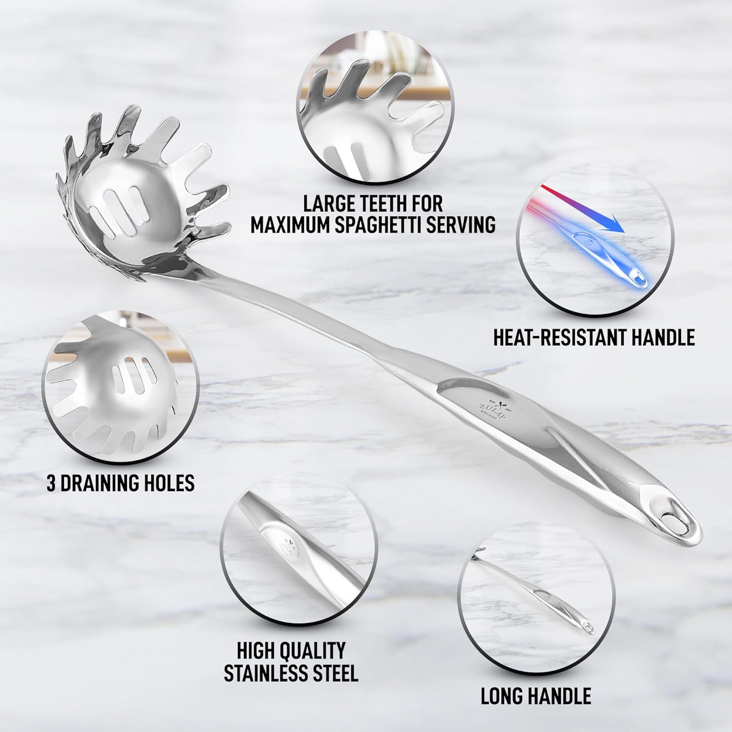 Zulay Kitchen Premium Stainless Steel Spaghetti Spoon - Pasta Spoon with Teeth - Metal Pasta Spoon - Pasta Fork Noodle Spoon - Easy to Use & Clean Pasta Utensil - 12’ Pasta Server