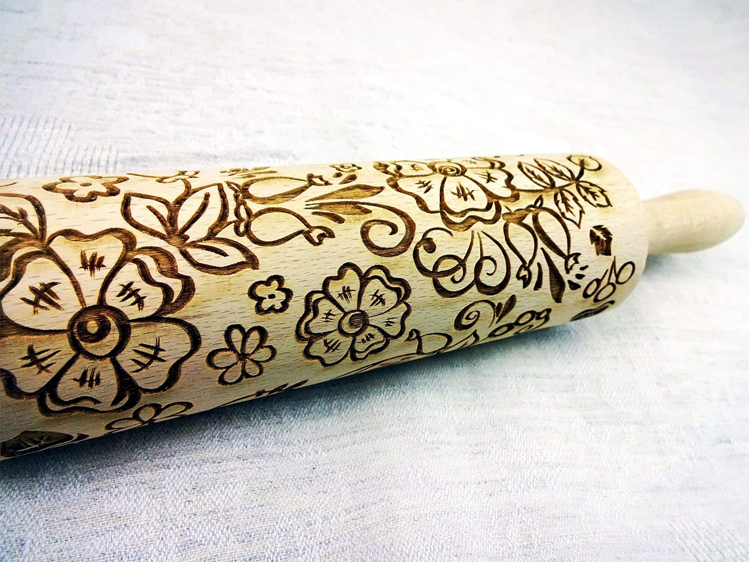 - Use beautifully handmade and finished beech wood kitchen accessories to bring your regular bakes to life with stunning patterns! Crafted from natural wood, this rolling pin features a deep, clearly defined pattern emboss to create stunning home-baked goods, crafts, and pottery!