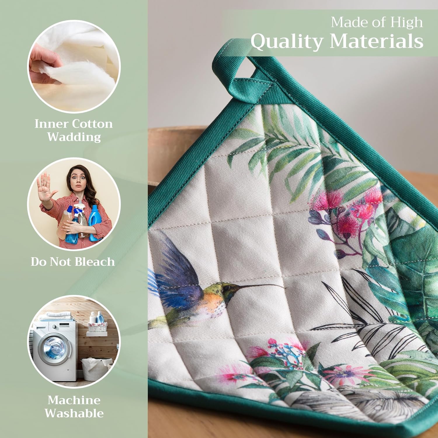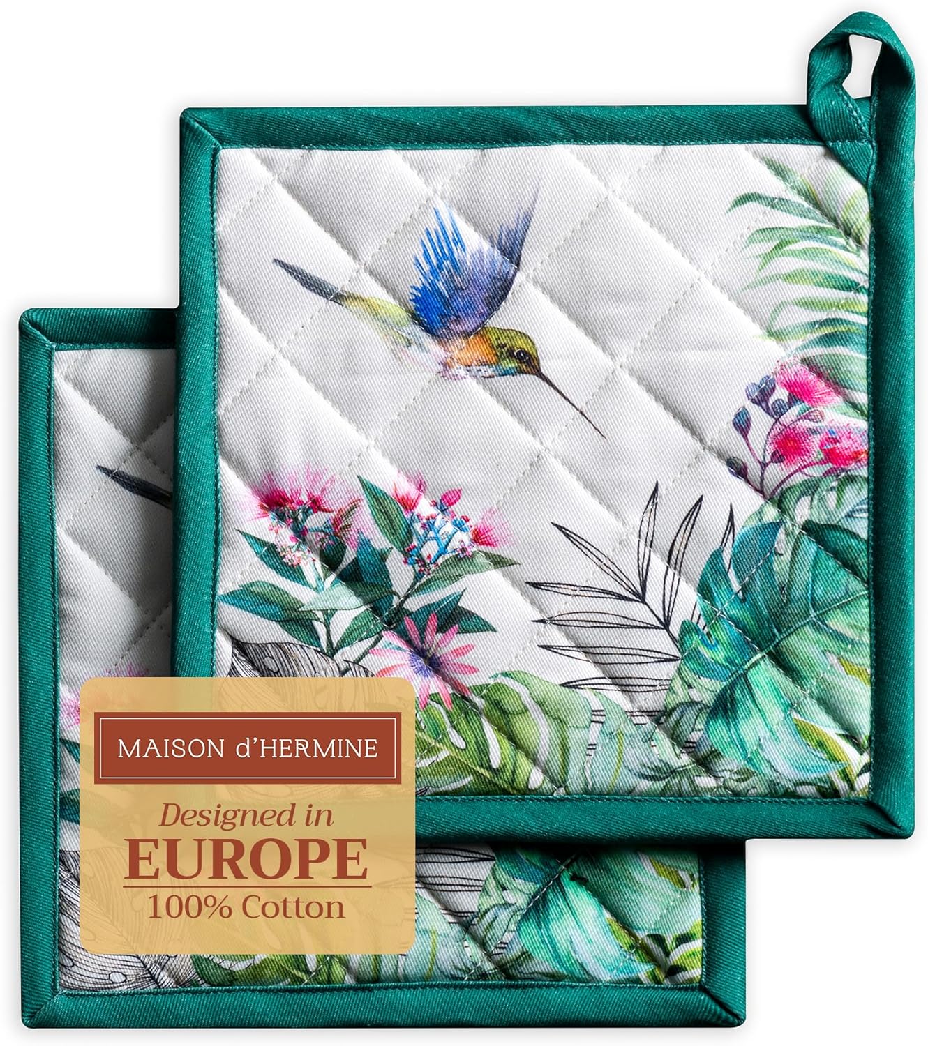 Maison d' Hermine Pot Holders Set 100% Cotton Heat Resistant Potholders 8" x 8" Hot Pads with Loop BBQ, Cooking, Baking, Grilling, Kitchen, Handling Hot Pans Spring/Summer (Pack of 2, Tropiques)