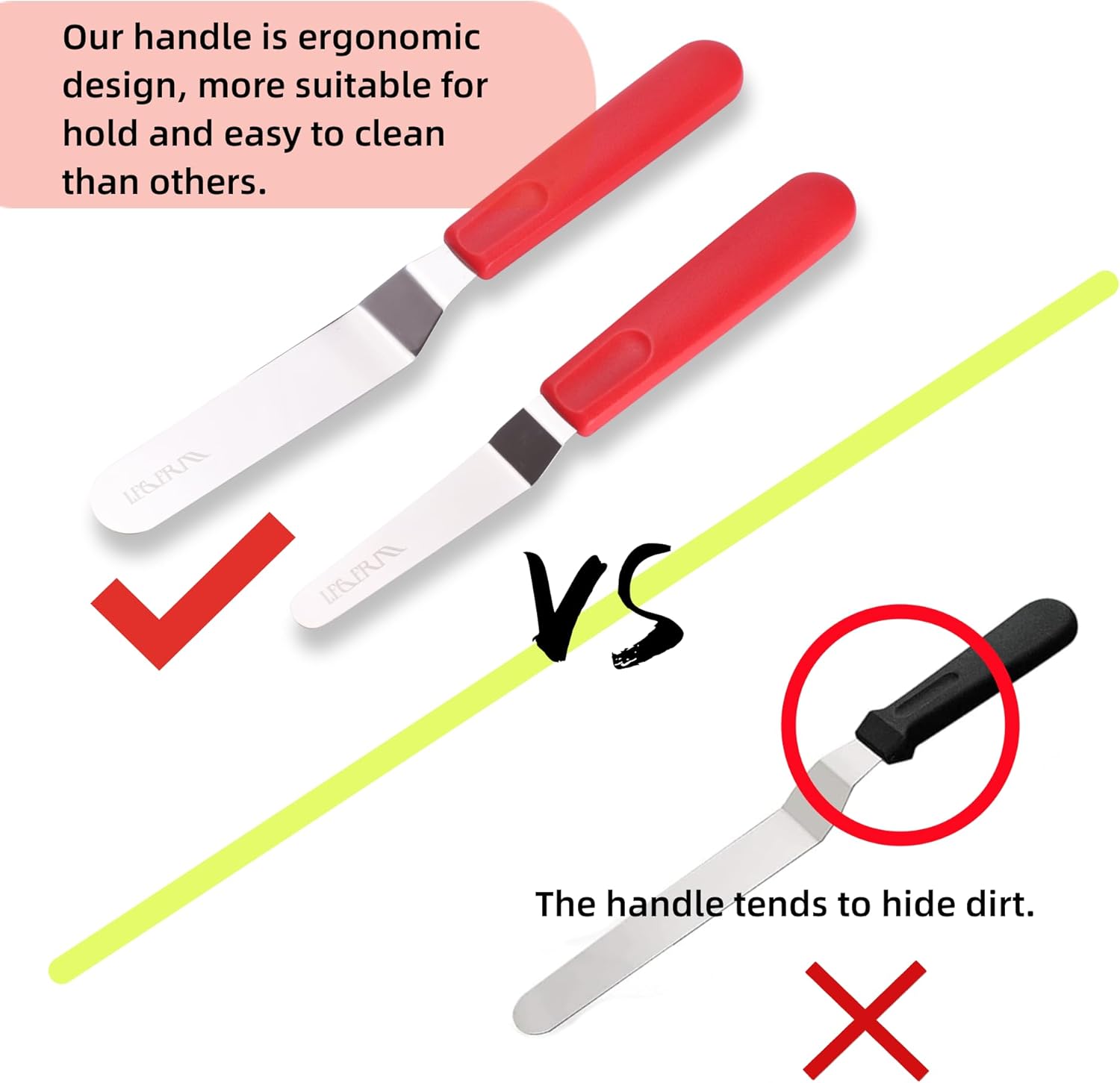 - Angled blade makes it super easy to ice or top a dessert in a pan, and more flexible so that you can control them better.
