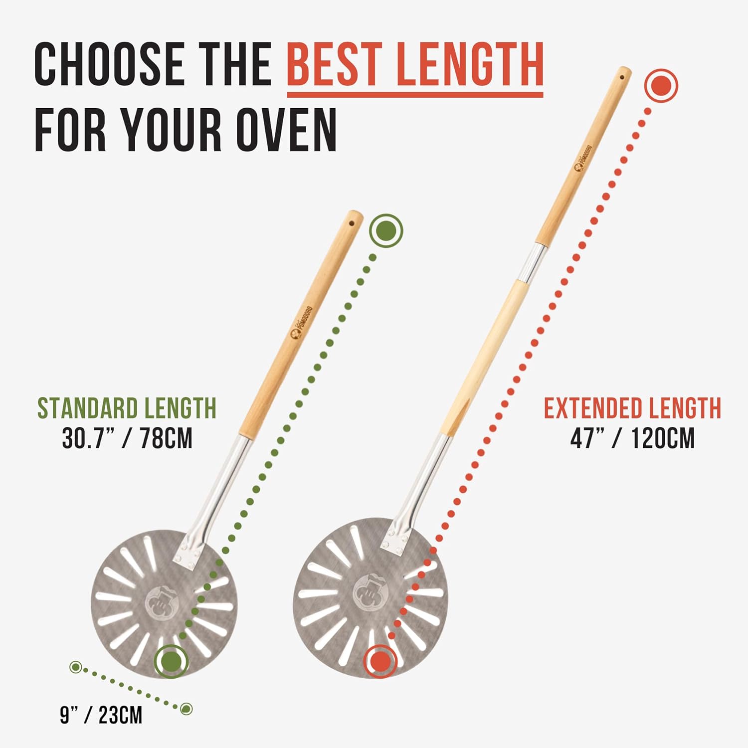 - EASY HANDLING: Chef Pomodoro’s 9” Aluminum Turning Peel is designed for easy maneuvering and rotating your pizza in a scorching hot oven. Featuring a hard anodized aluminum head and detachable 47” wooden handle, the peel can handle both home pizza ovens and commercial sized ovens. Get the peel designed by and for professionals.