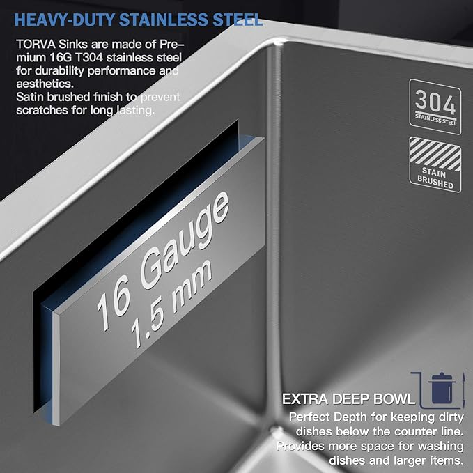 - Premium Quality and Durability: Crafted from premium 304 stainless steel, the TORVA 28 Inch kitchen sinks offer superior resistance to rust, corrosion, and stains, ensuring long-lasting performance in your kitchen. Its robust construction withstands the rigors of daily use