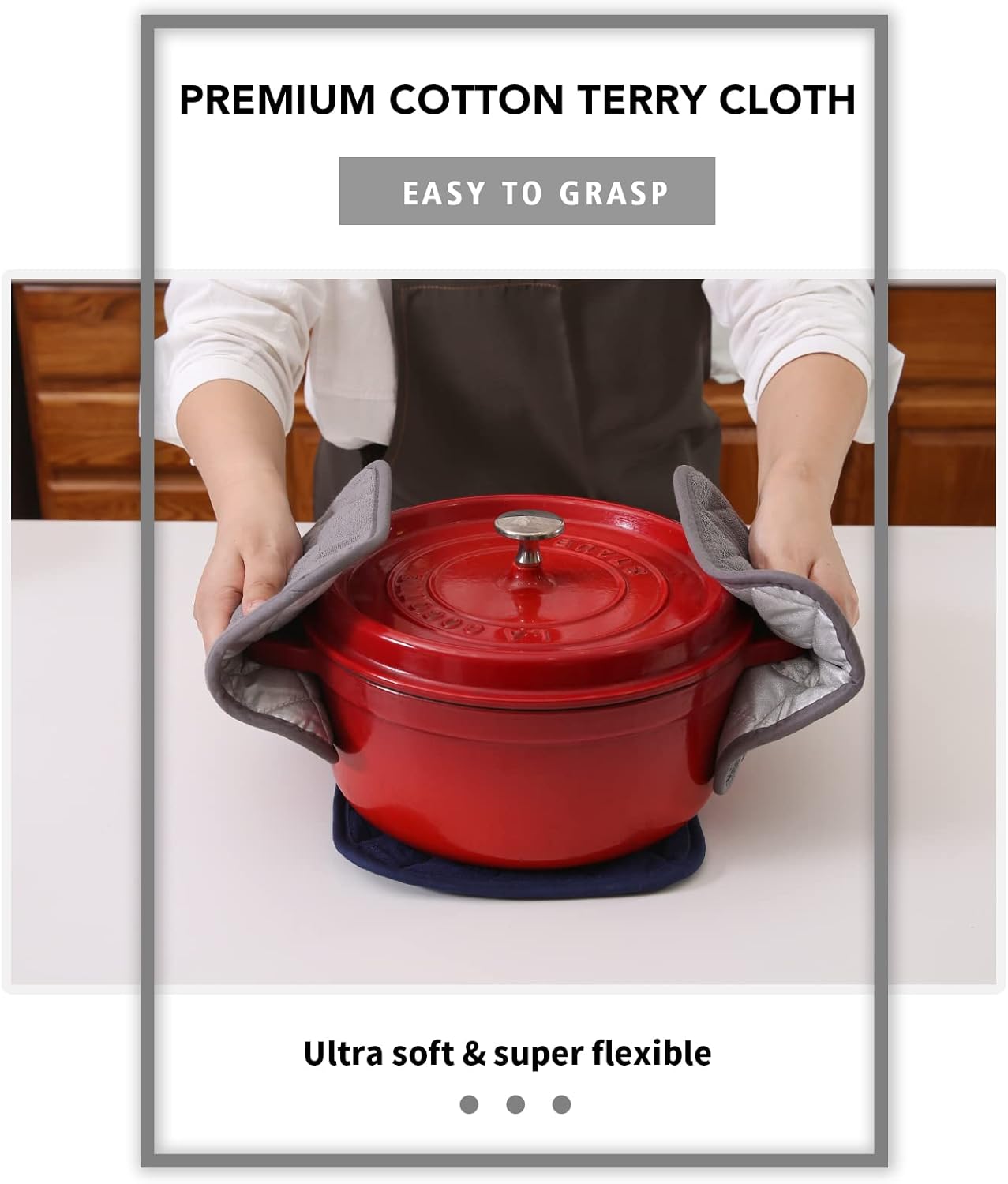 - QUILTED AND PADDED - Heat resistant up to 400 degrees allowing safe removal of baking dishes and cast iron from the oven and hot pots from the stove.