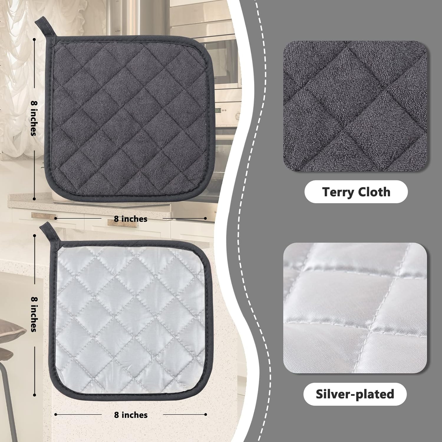 - PROTECT YOU FROM HEAT - The construction of these pot holders for kitchen helps to protect your hands and arms from the heat of the oven. Do not use pot holders in a hot oven or over an open flame.