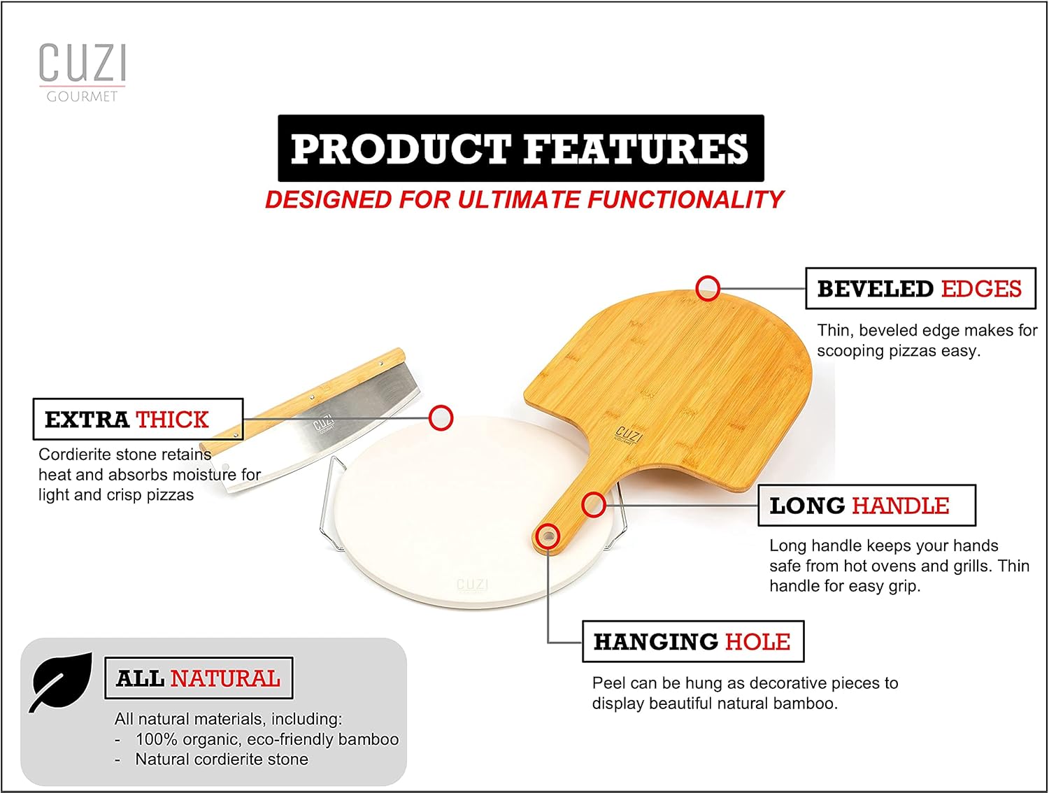 - MADE WITH ALL-NATURAL MATERIALS: Cut environmental guilt (and pizza) with beautiful, eco-friendly bamboo and natural cordierite stone. Cuzi Gourmet pizza accessories don't contribute to harmful deforestation, so you can save the trees while you enjoy gooey mozzarella cheese. Nature and your tastebuds will be forever grateful!
