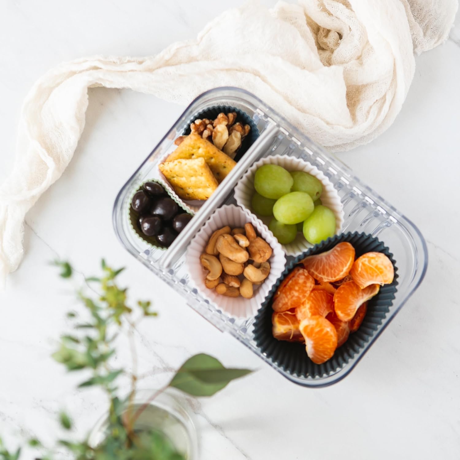 - INCLUDES 12 jumbo food-grade silicone baking cups in 4 beautiful colors, 3 Navy, 3 Dusty Blue, 3 Sage Green, 3 Designer White, packaged in a gift worthy The Silicone Kitchen reusable cotton mesh produce bag