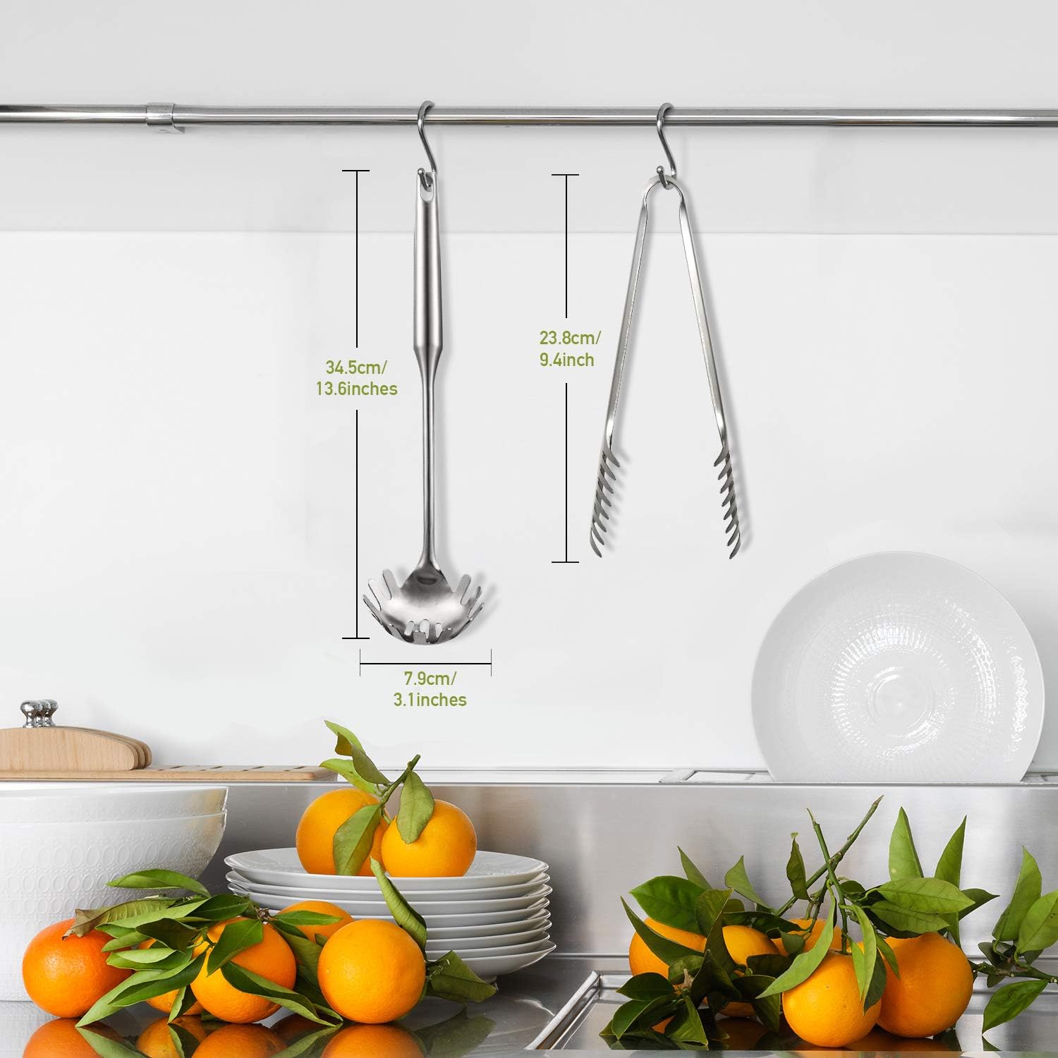 - Large size: the size of stainless steel pasta fork is approx. 34.5 x 7.9 cm/ 13.6 x 3.1 inches, long enough handle can efficiently prevent burns to your hands when cooking pasta; The size of stainless steel pasta tong is approx. 24 x 3.8 cm/ 9.4 x 1.5 inches, comfortable to use and easy to grip; Please check the size carefully before buying