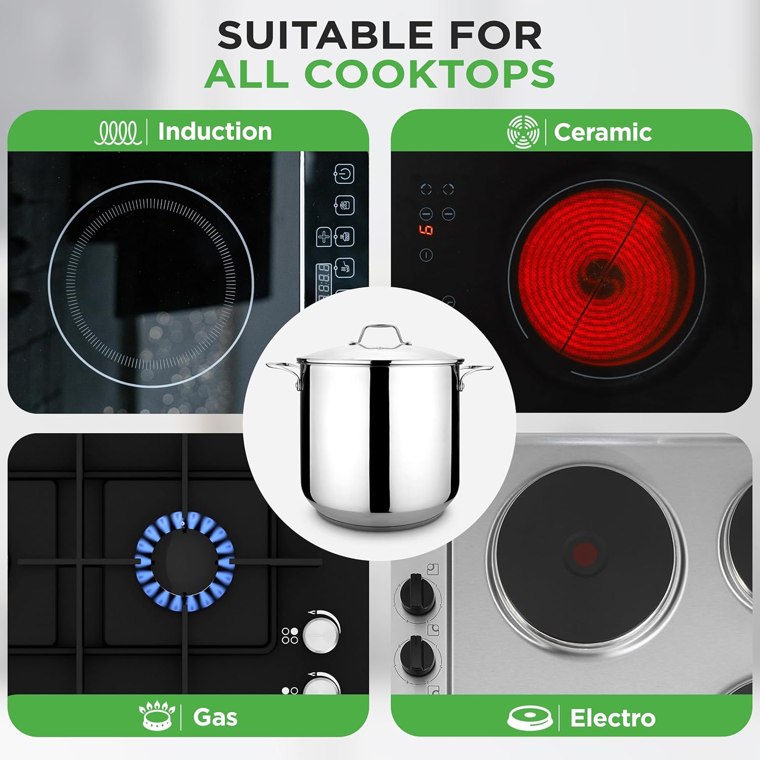 - INDUCTION READY: The heavy duty stainless steel stock pot is designed for safe use in electric, gas, induction, ceramic, hot plate & halogen cook tops. Though dishwasher safe, hand washing is highly recommended to preserve the stainless steel shine