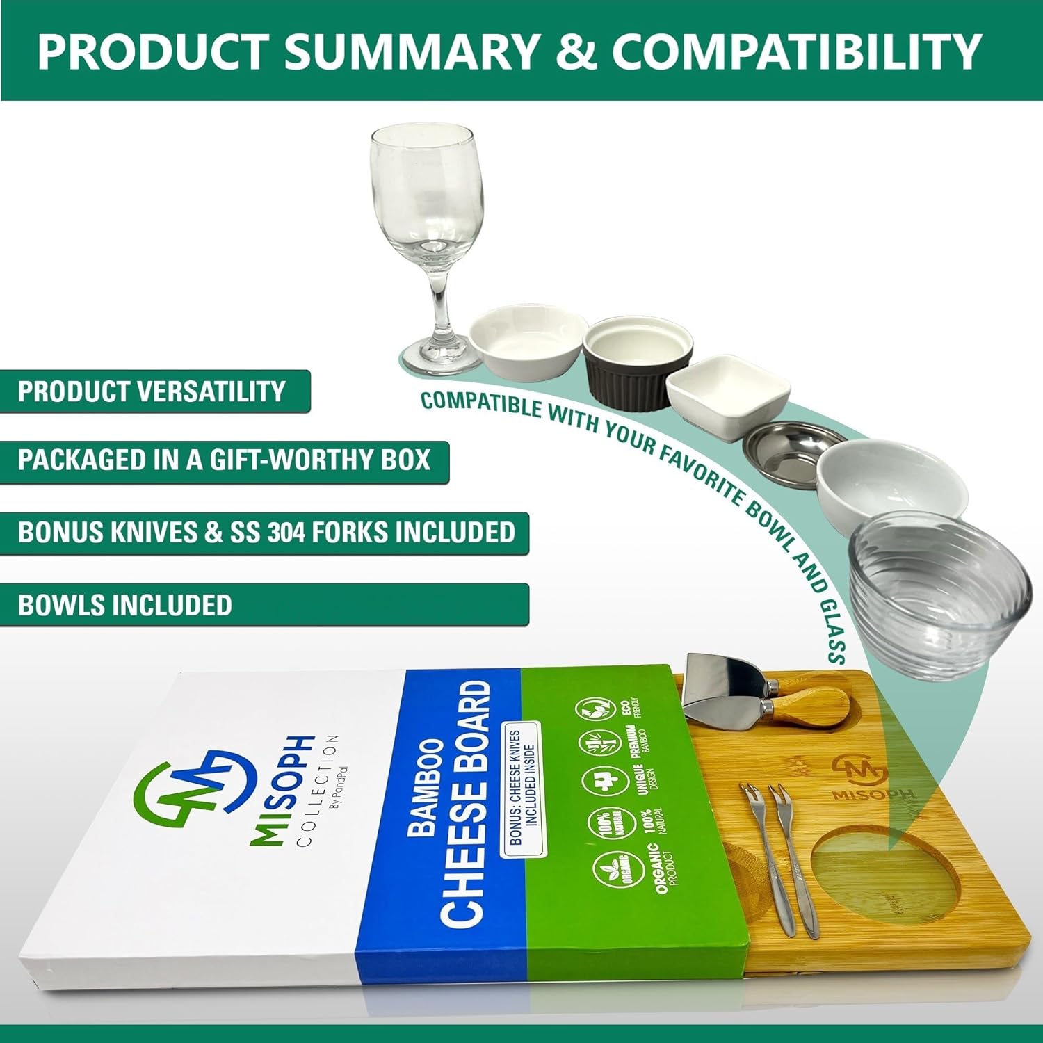 Bamboo Cheese Board with Knife, Bowl, Fork Set, Wood Charcuterie Platter & Food Serving Tray for Wine Glasses, Misoph Collection