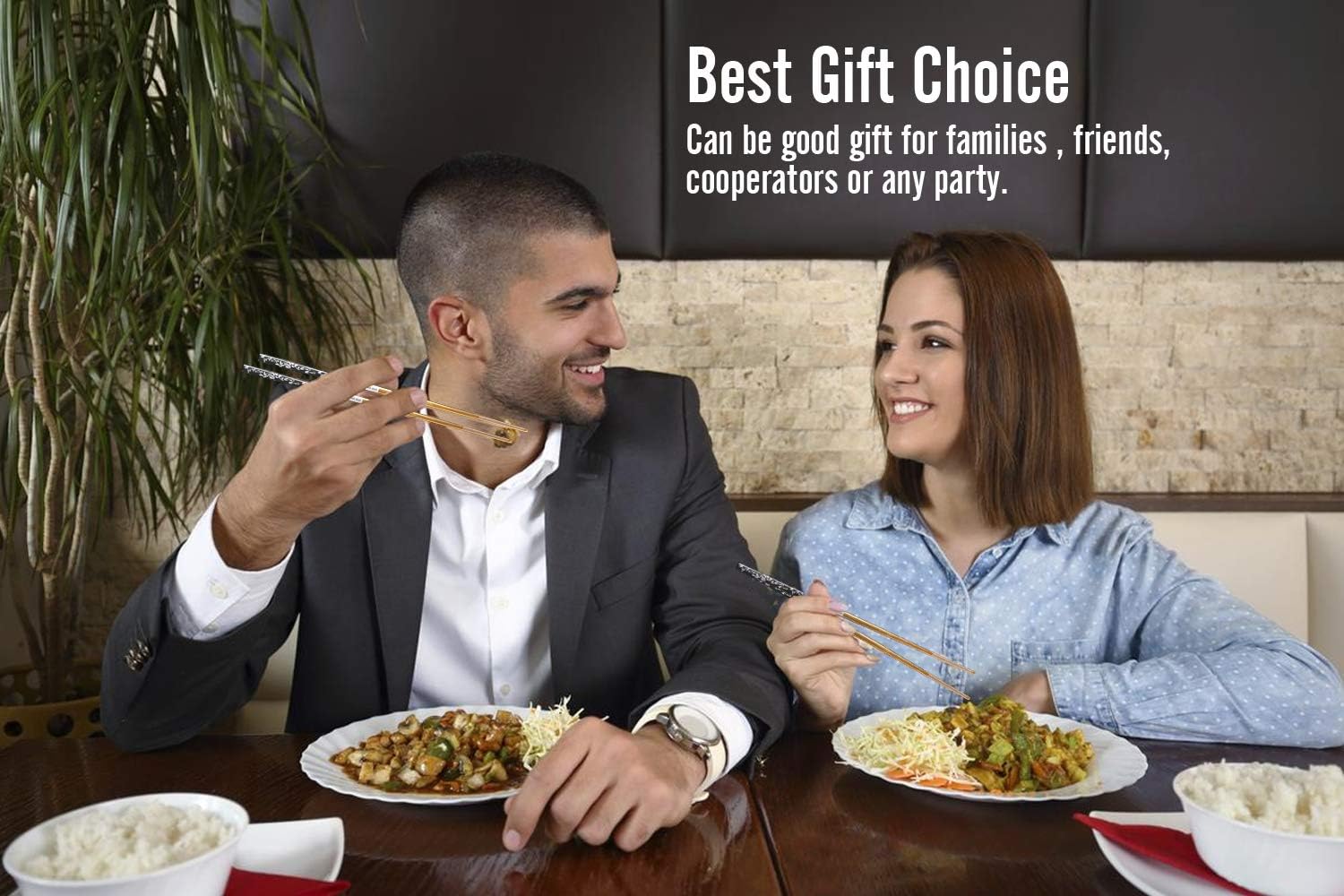 - ✿ 【Best Gift Choice】: The metal chopsticks are with beautiful leaf pattern and black background on chopsticks end. The whole stainless steel chopsticks are titanium plated. The elegant looking and the gift box package make the stainless steel chopsticks very good presentation. Chopsticks mean good cooperation and best friendship. So it is nice gift to friends, lovers, families and cooperates. The reusable chopsticks use longer and the love you present will last longer.
