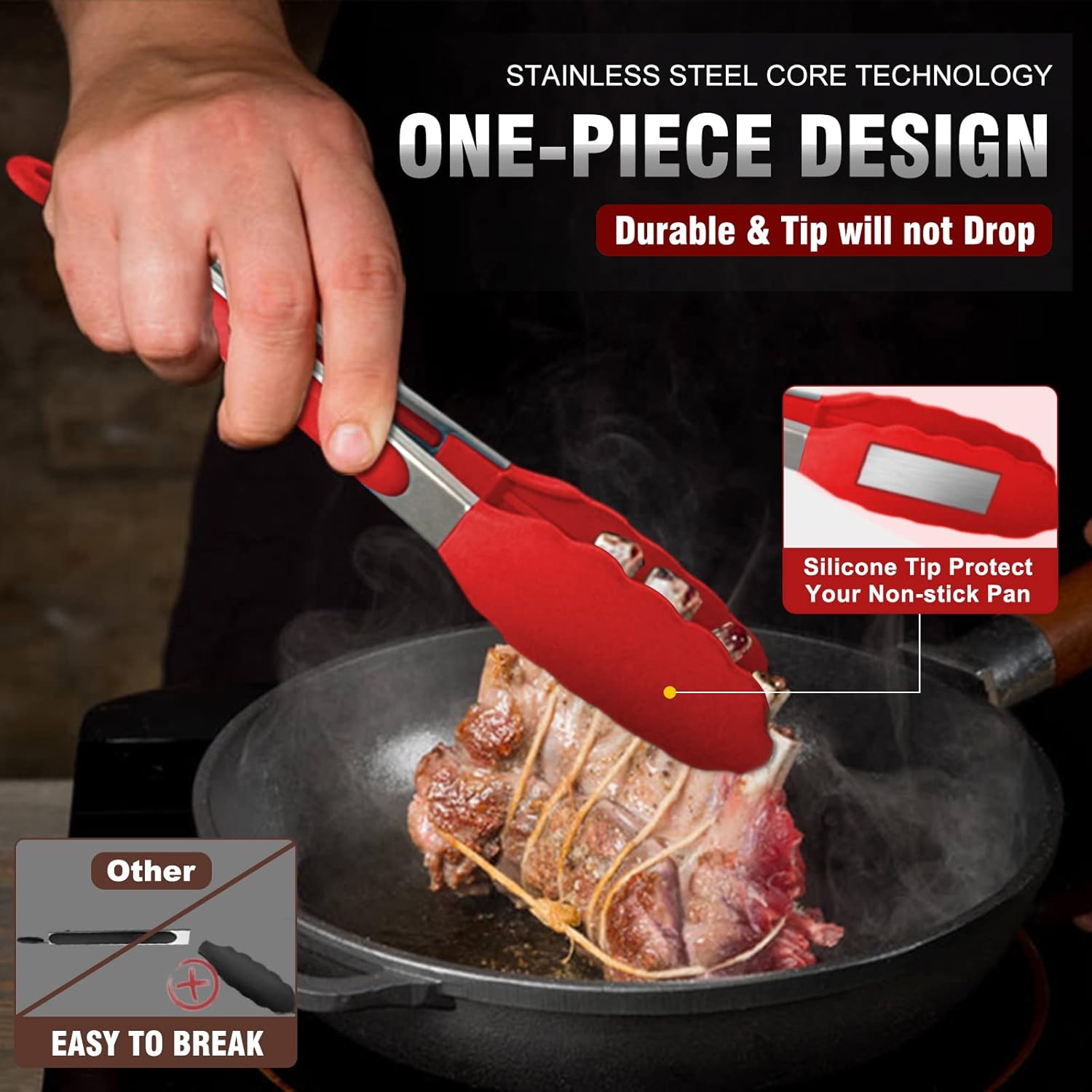 - ✓NON STICK SILICONE TIP, won't MELT, RUST OR FLAKE-The tip is made of food-grade and BPA free silicone, which is safety-tested, heat resistant up to 480°F and will never rust. Food tongs with non-stick silicone tips protect your cookware from damage, easy to clean and dishwasher safe.