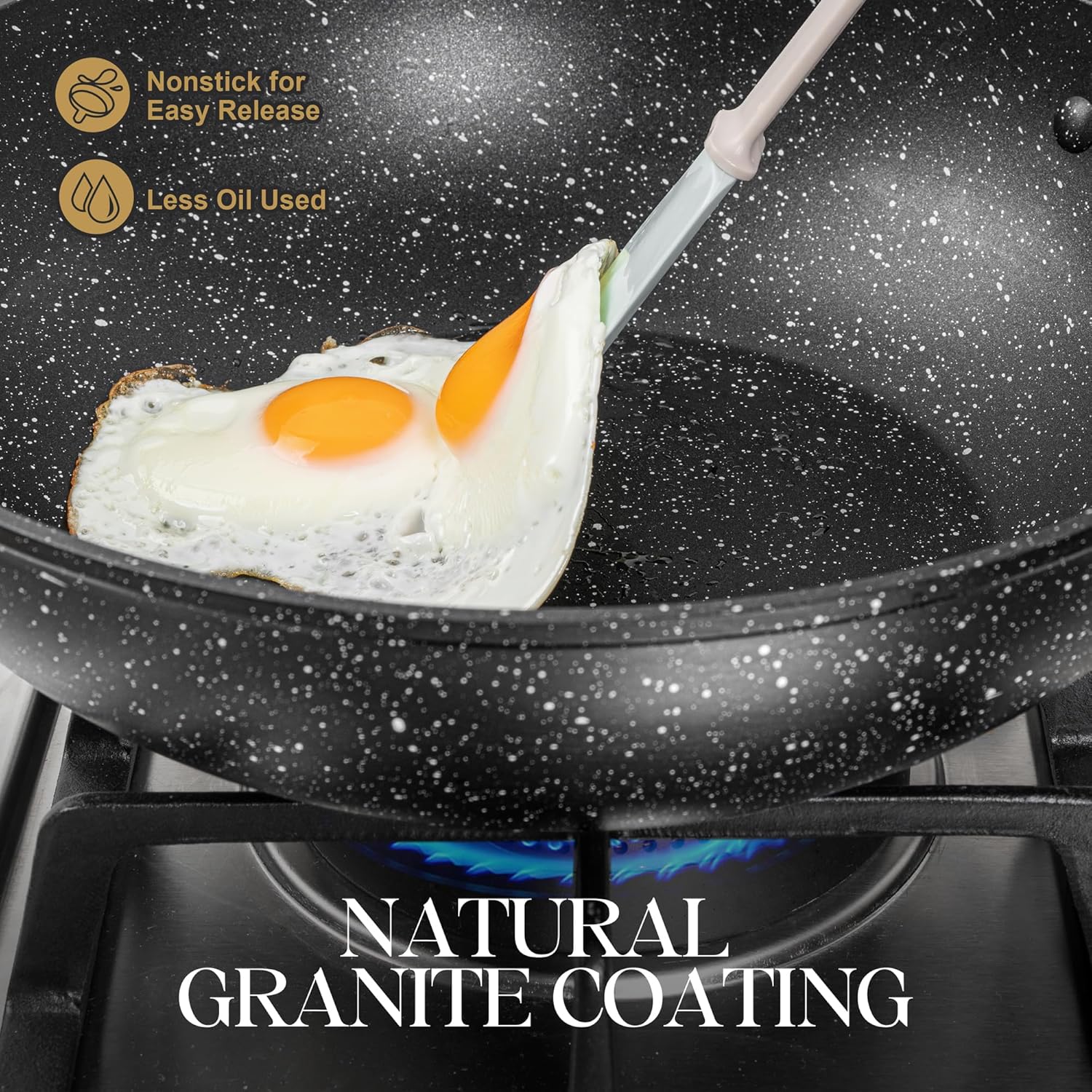 - Healthy Nonstick Coating - The granite non stick wok coating is free from toxic substances, ensuring health cooking, making cleaning effortless.