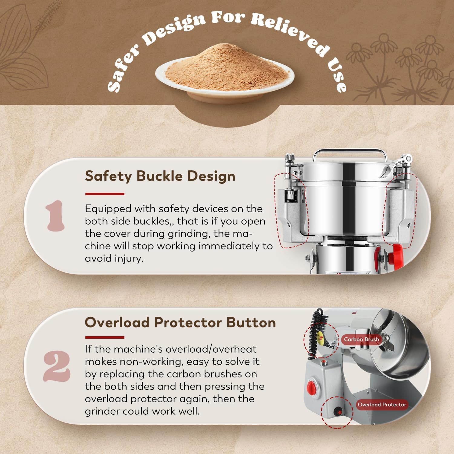 - Safer Design For Relieved Use - Our electric grain grinder is equipped with safety buckles on the both sides, which will immediately stop the machine from working if you open it during grinding to prevent injury. And with upgraded overload protector, the grinder will stop working to prevent the motor burnout in cases of overload or overheating.