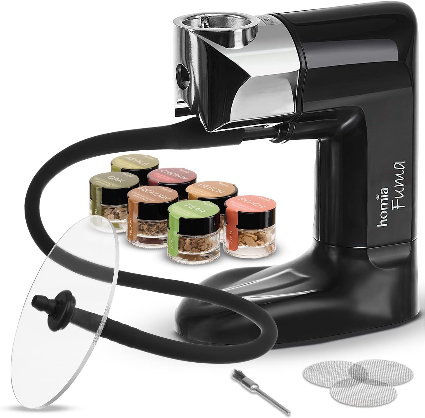 - COMPLETE COCKTAIL SMOKER SET - Starter Set included 13 pcs for instant start. Everything you need to try the best smoked food - Smoke Infuser, flexible hose, Disk Lid, 7 flavors wood chips, 4 x AA Batteries, extra Mesh Set, Cleaning Brush. Flexible hose and specially designed nozzle make this Smoking Gun a versatile all-purpose Food Smoker. Ready to use out of the box!