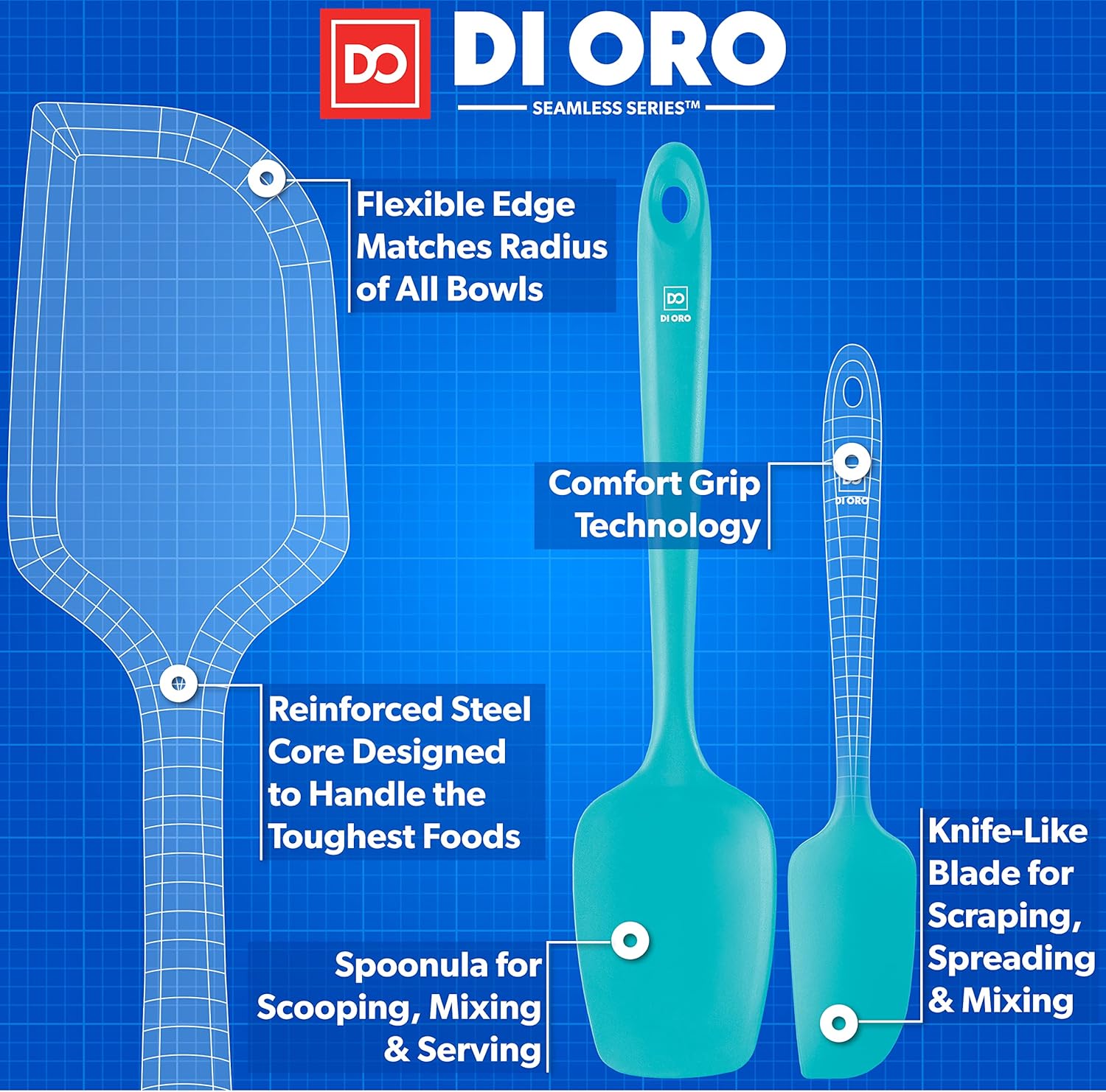 - CLEANS EASY, SEAMLESS ONE-PIECE DESIGN – You will be happy to know that your Award-Winning DI ORO Seamless Series Spatulas are dishwasher safe or can be quickly and effortlessly cleaned by hand. The one-piece seamless silicone design prevents buildup of food and grime, which allows for safe and healthy cooking.
