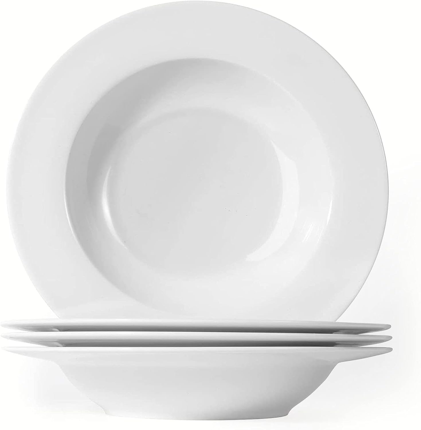 Artena 8 Ounces Pasta Bowls Set of 4, 8.5 inch Soup Bowls, Advanced Porcelain Salad Bowl, Wide Rim Pasta Plates, Shallow Bowls for Kitchen, Rimmed White Plates and Bowls Set, Microwave Oven Safe