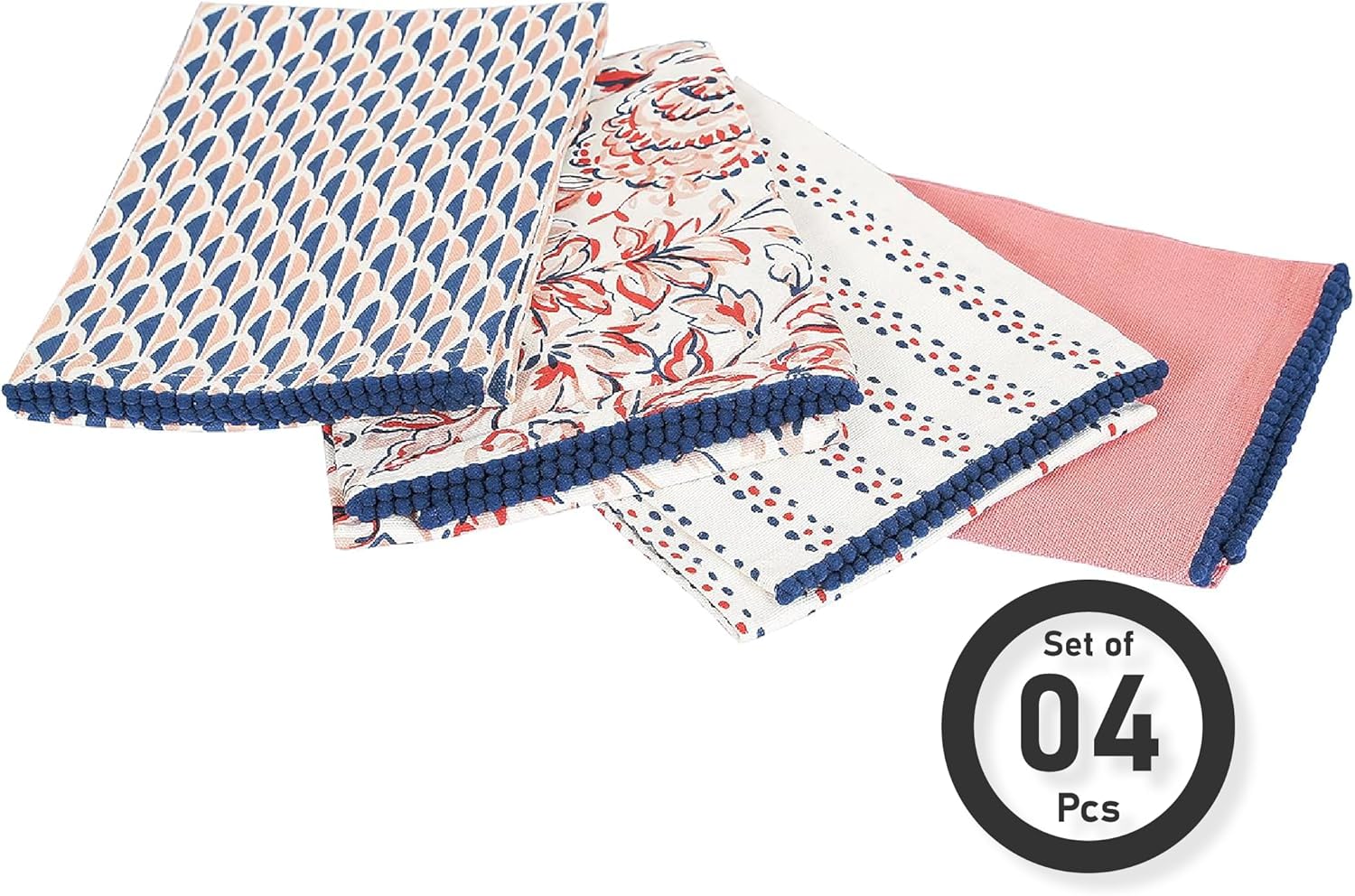 - PACKAGE CONTENT & SIZE : The durable cotton cloth measures approx 18"x28" set of 4 printed kitchen & table linens Cloth Napkins Set of 4 includes: 3 All Overall hand printed Dish towel and a complimentory Printed Dish towel. so you’ll always have plenty on hand. Lint free quick dry comes with hanging loops and no color fade after multiple wash Its perfect for everyday use.