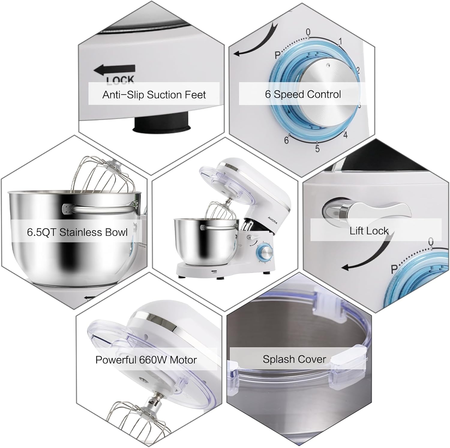 Aucma Stand Mixer,6.5-QT 660W 6-Speed Tilt-Head Food Mixer, Kitchen Electric Mixer with Dough Hook, Wire Whip & Beater (6.5QT, White)