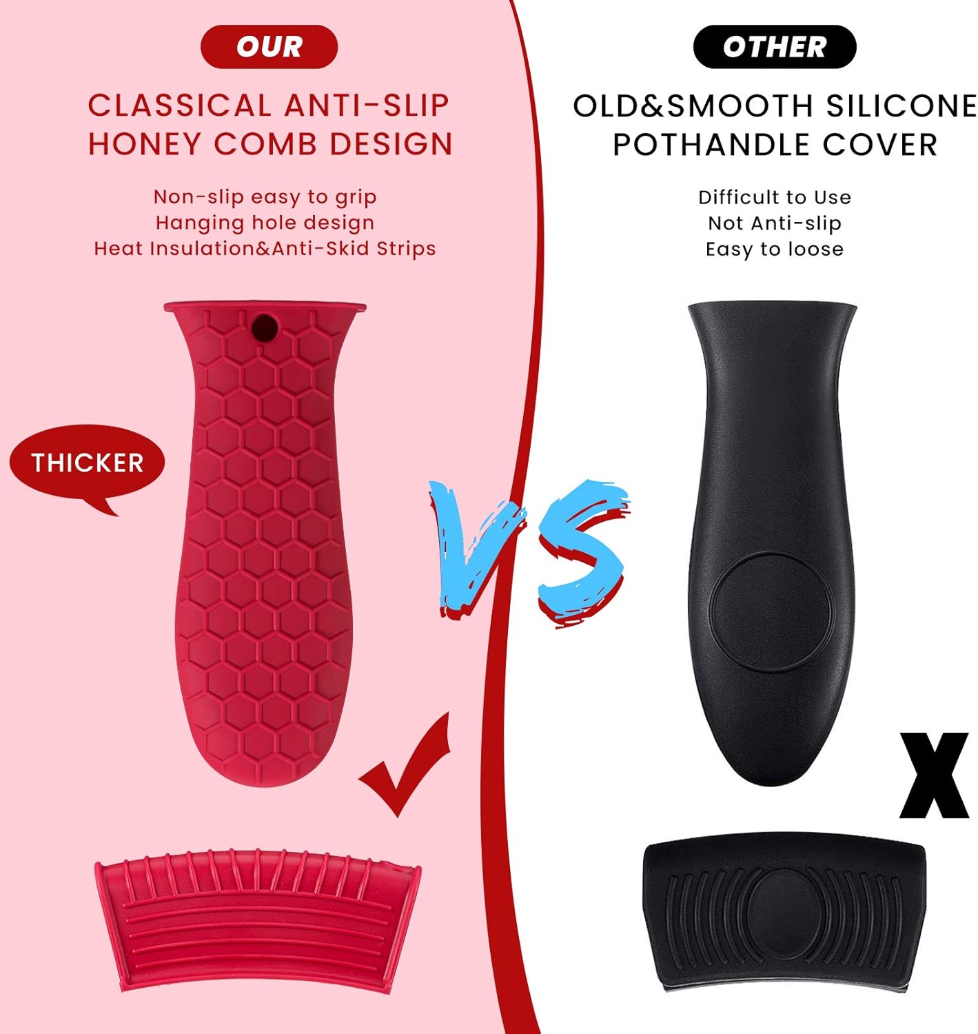- Anti-slip design: these hot resistant pot sleeve grip handle holders feature honeycomb pattern design on the outside and concave-convex design on the inside to make the handle holder grip stronger and less slippery; The silicone hot skillet handle cover has a handy hanging hole if you prefer to store on a hook, making cooking, baking, etc. in your kitchen easier and fun