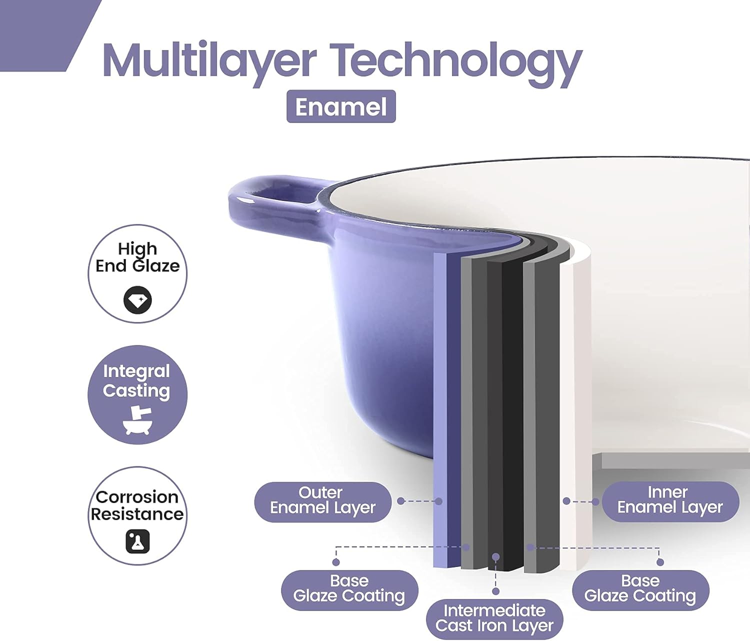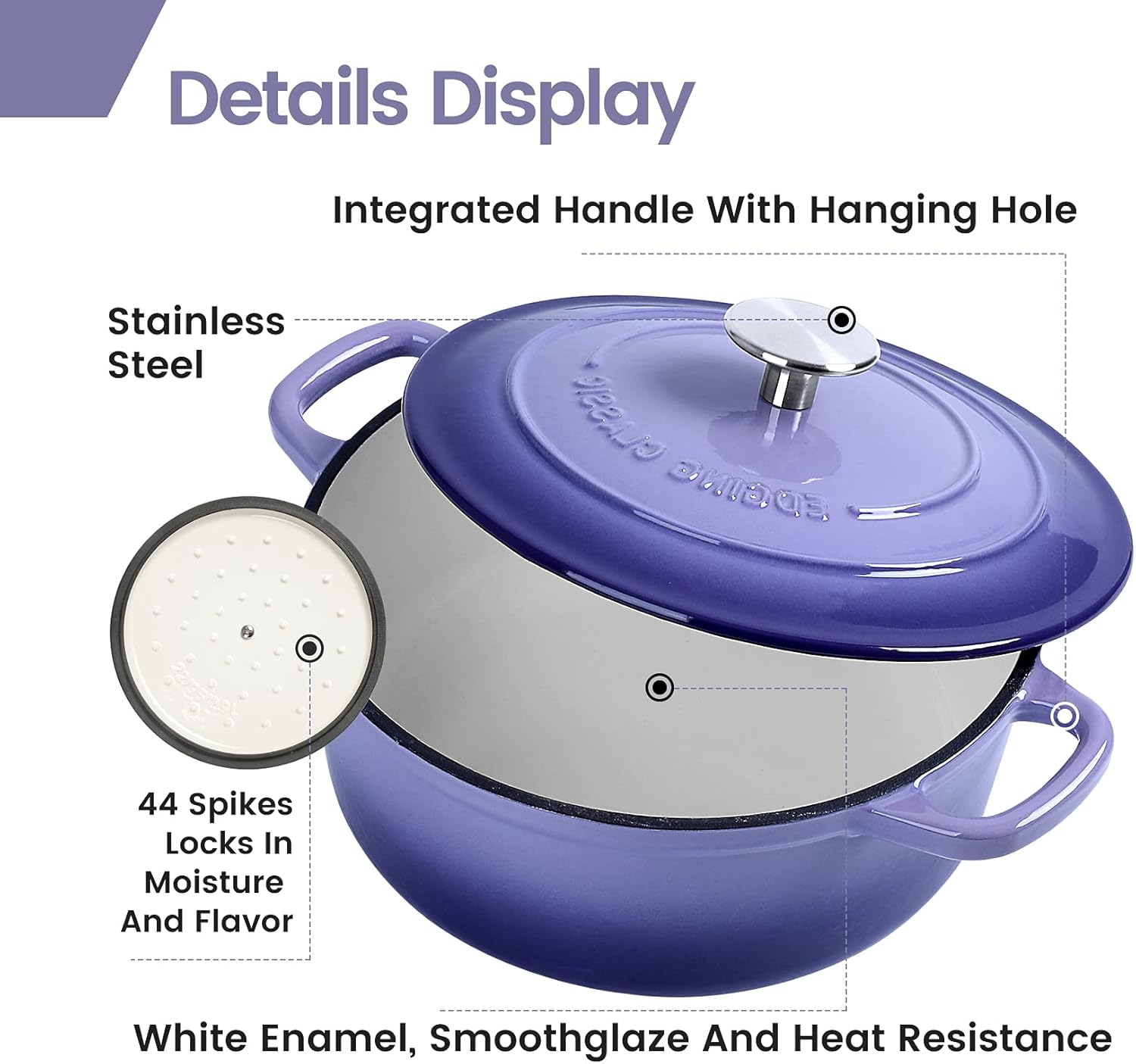 - Suitable for 6-7 people: The 5.5 quart enamel Dutch oven is the choice for cooking food and desserts. Its design makes your food look more delicious